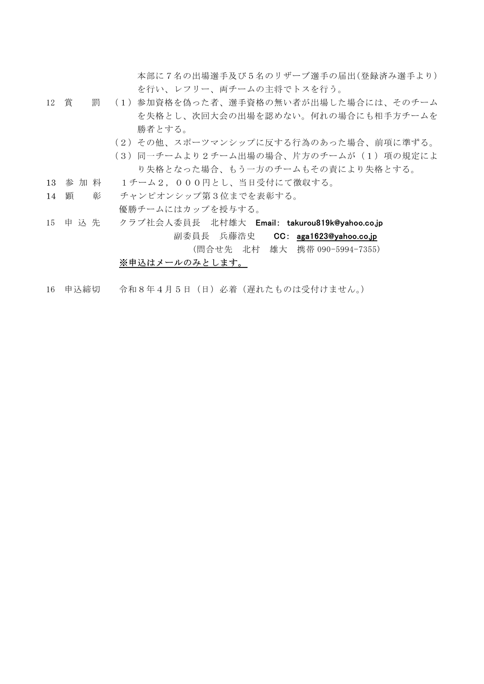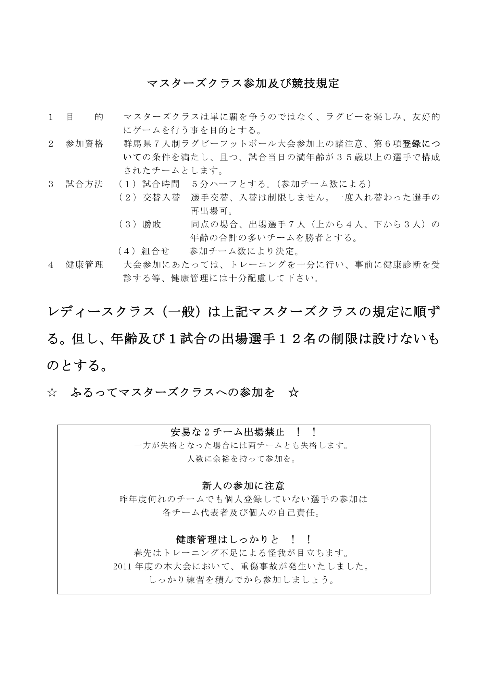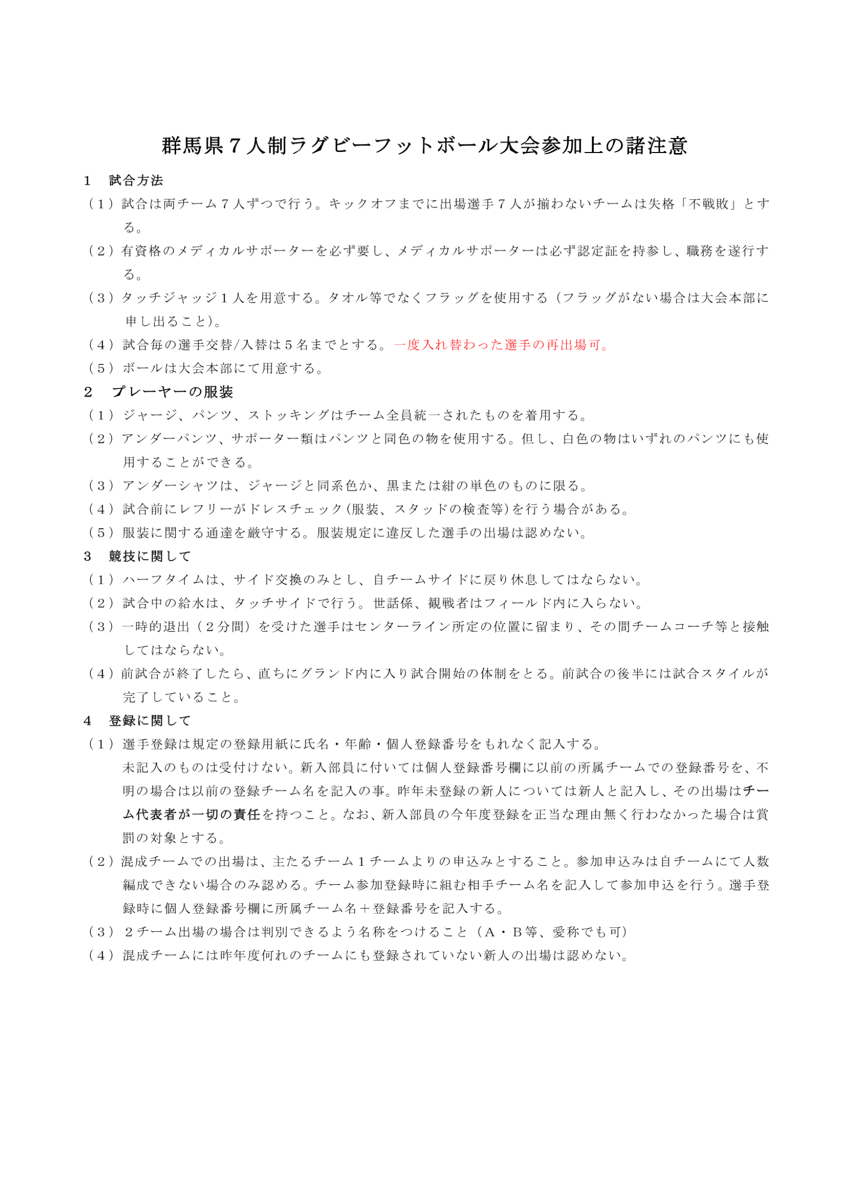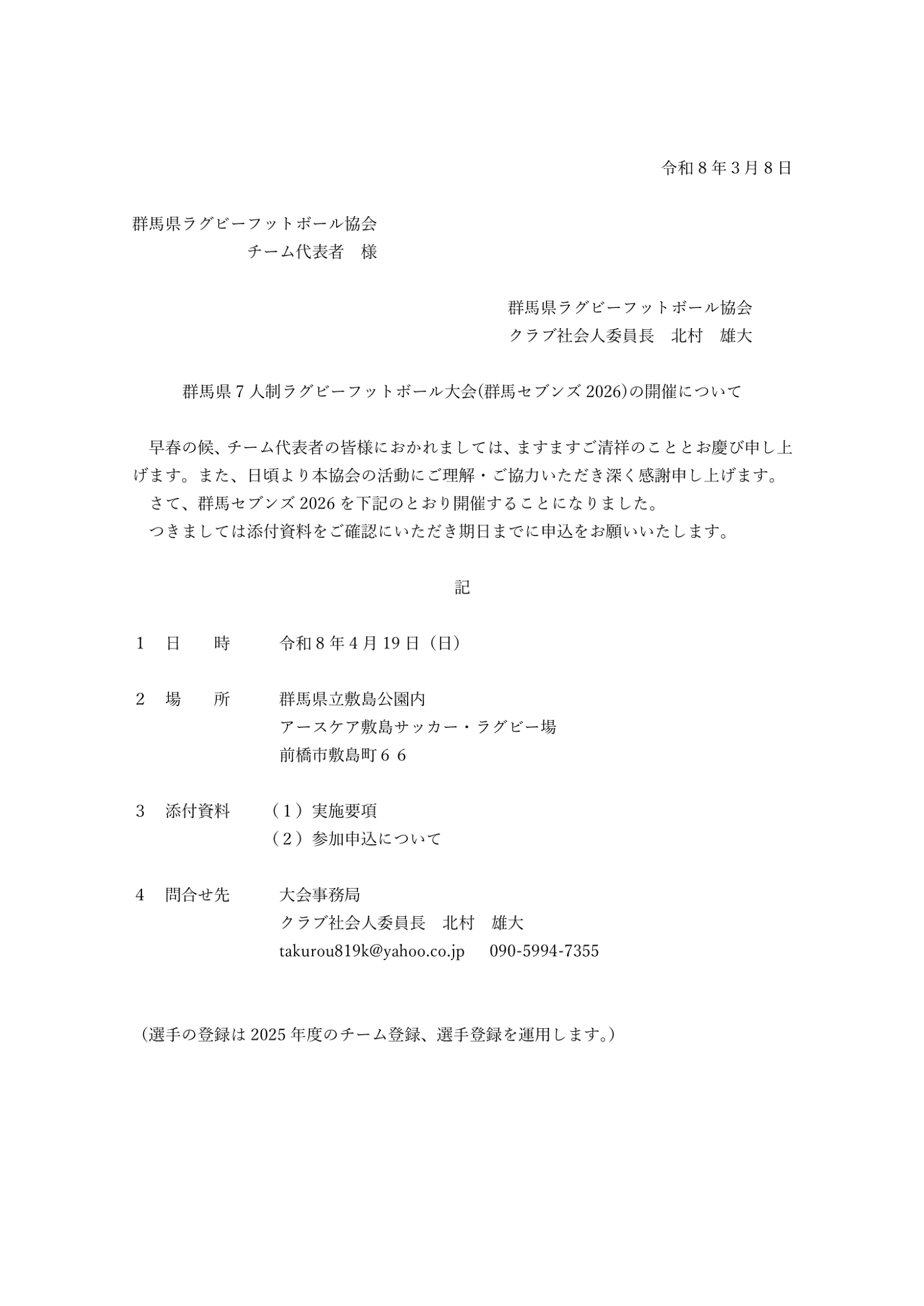 HOME 県協会とは お知らせ » ニュース ニュース一覧 試合結果 facebook » 公式 チケット販売 大学 委員会 » ジュニア 高校 大学 クラブ社会人 競技 コーチ 普及育成 総務 メディカル 安全対策 レフリー アセッサー 強化セレクション 競技場 チケット お問い合わせ 住所 電話 メール 第50回群馬県7人制ラグビーフットボール大会(群馬セブンズ2026) 開催要項 実施要項 ダウンロード 大会実施要項 開催要項.pdf ファイル名 50-01.pdf(Adobe Acrobat) 実施要項 ファイル名 50-02.pdf(Adobe Acrobat) ダウンロード 参加申込書 参加申込書 ファイル名 50-03.xls(Microsoft Excel Document)