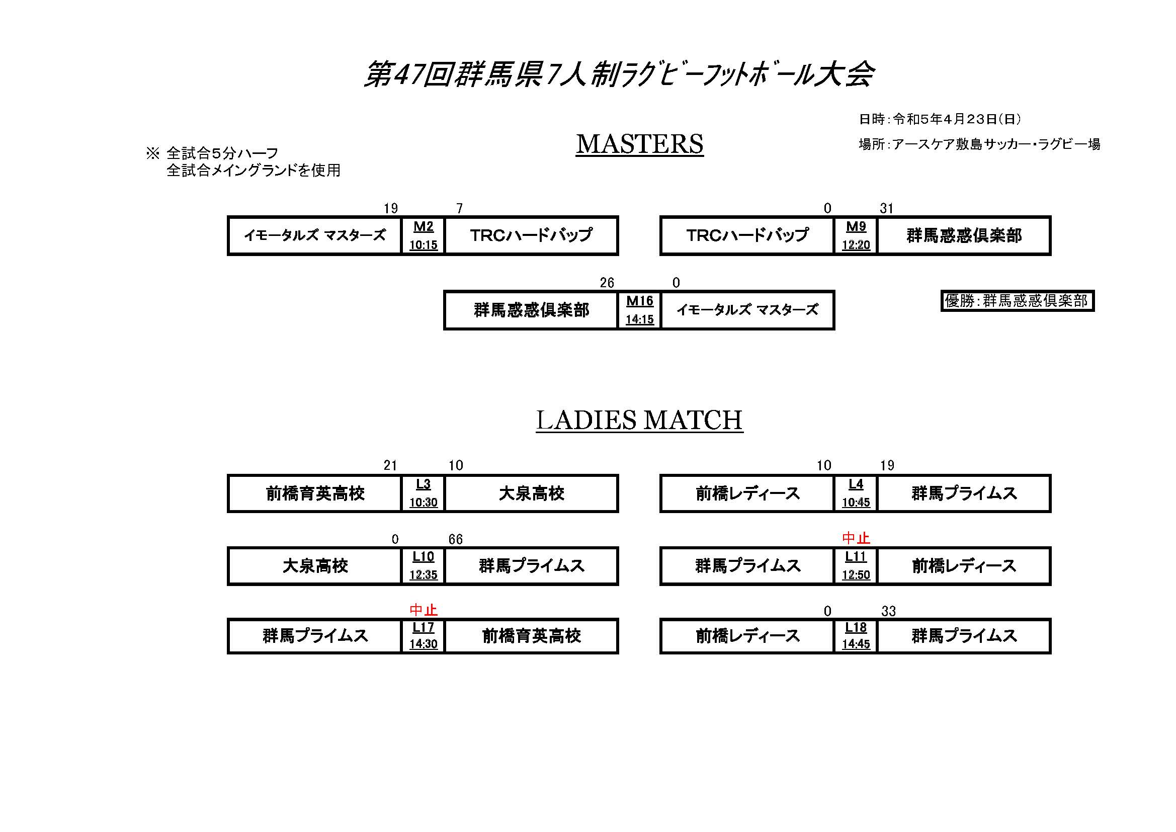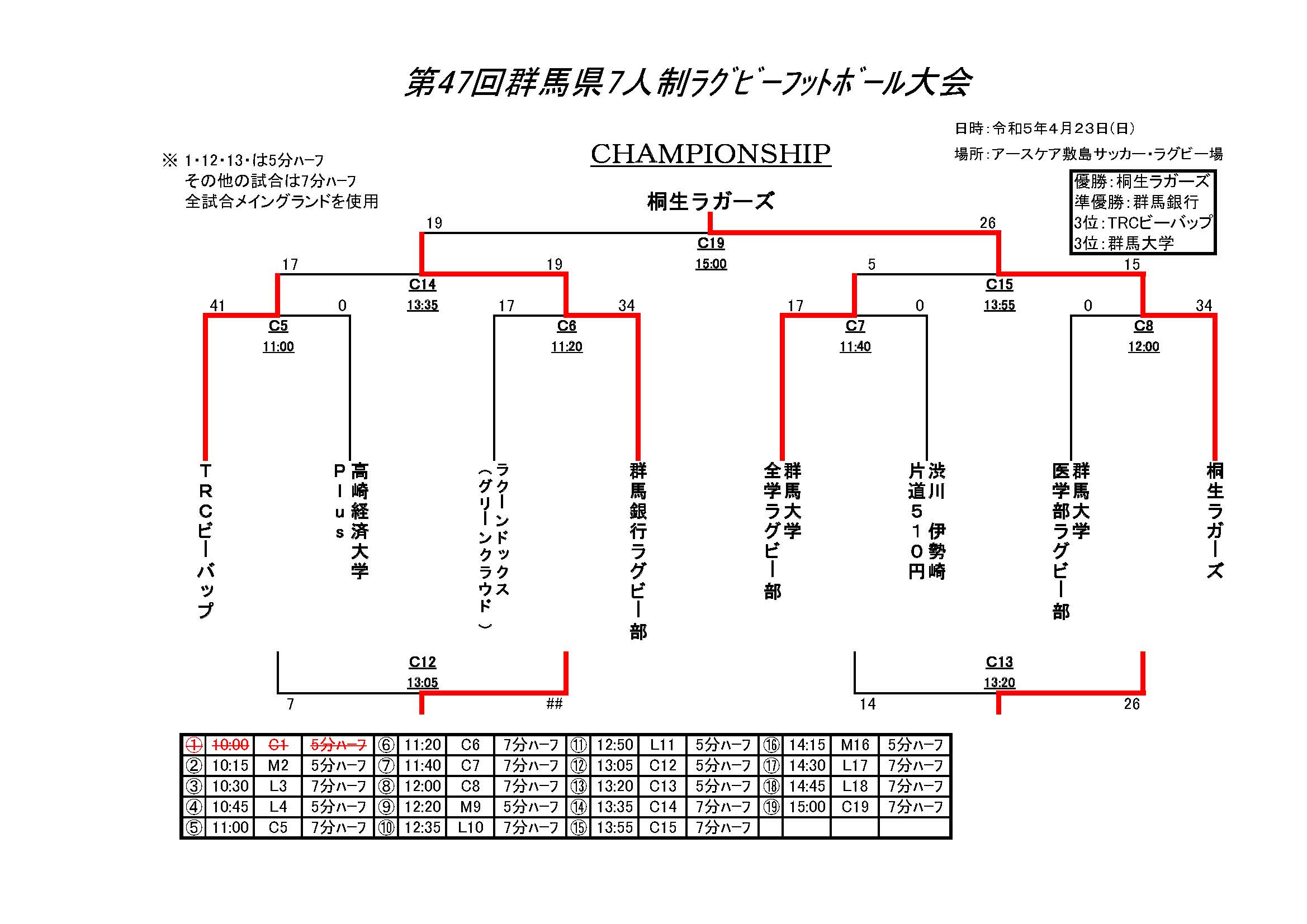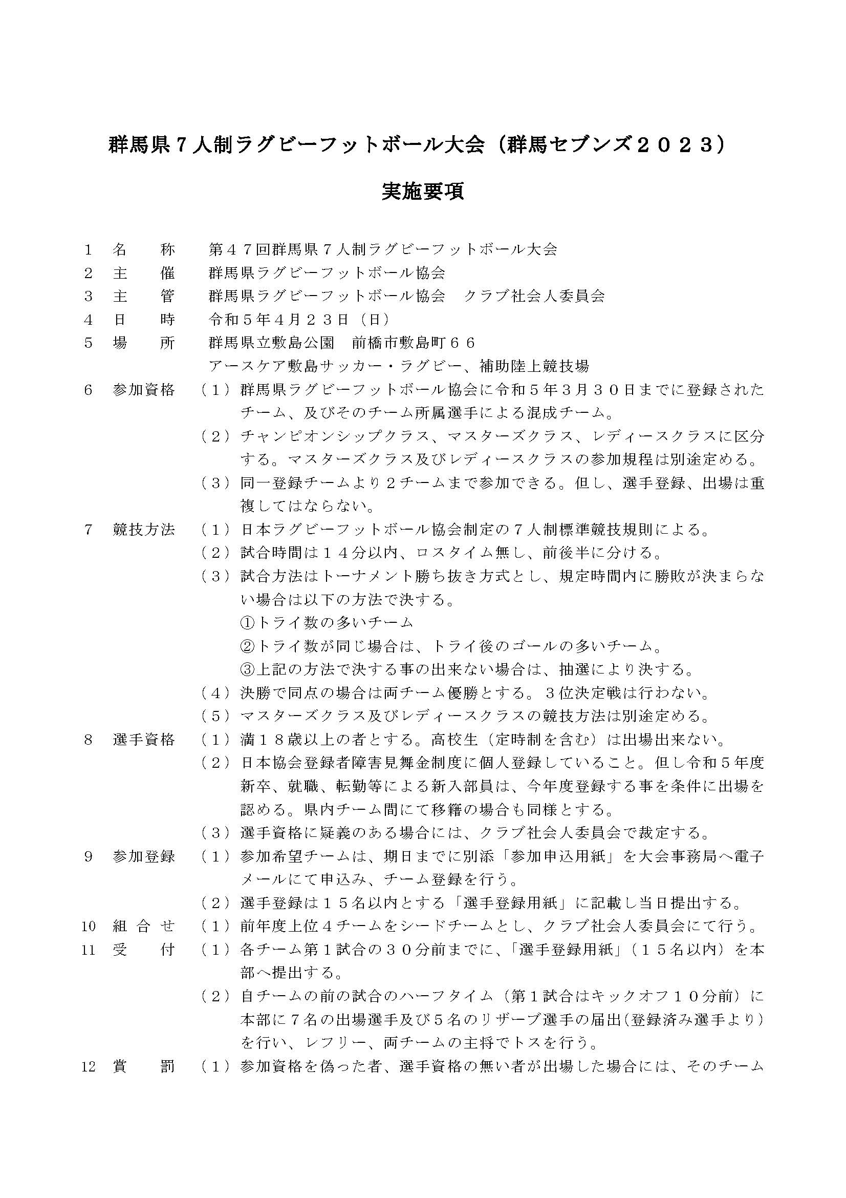 HOME 県協会とは お知らせ » ニュース ニュース一覧 試合結果 facebook » 公式 チケット販売 大学 委員会 » ジュニア 高校 大学 クラブ社会人 競技 コーチ 普及育成 総務 メディカル 安全対策 レフリー アセッサー 強化セレクション 競技場 チケット お問い合わせ 住所 電話 メール 第47回群馬県7人制ラグビーフットボール大会 試合結果 大会実施要項 ダウンロード 大会実施要項 実施要項 ファイル名 47-2023-01.doc(Microsoft Word Document) 実施要項 ファイル名 47-2023-01.pdf(Adobe Acrobat) ダウンロード 参加申込書・選手登録用紙 参加申込書・選手登録用紙 ファイル名 47-2023-02.xls(Microsoft Excel Document)