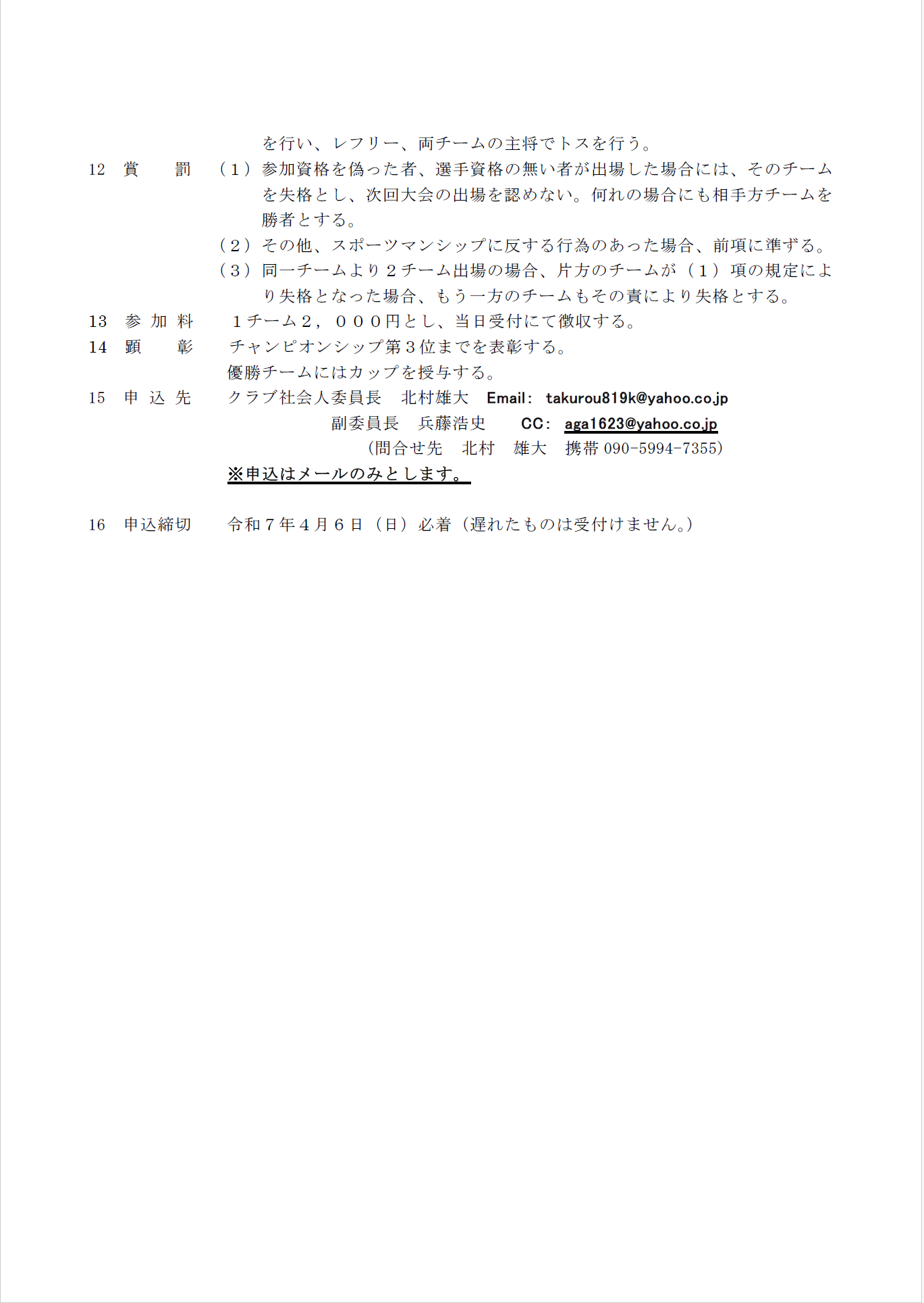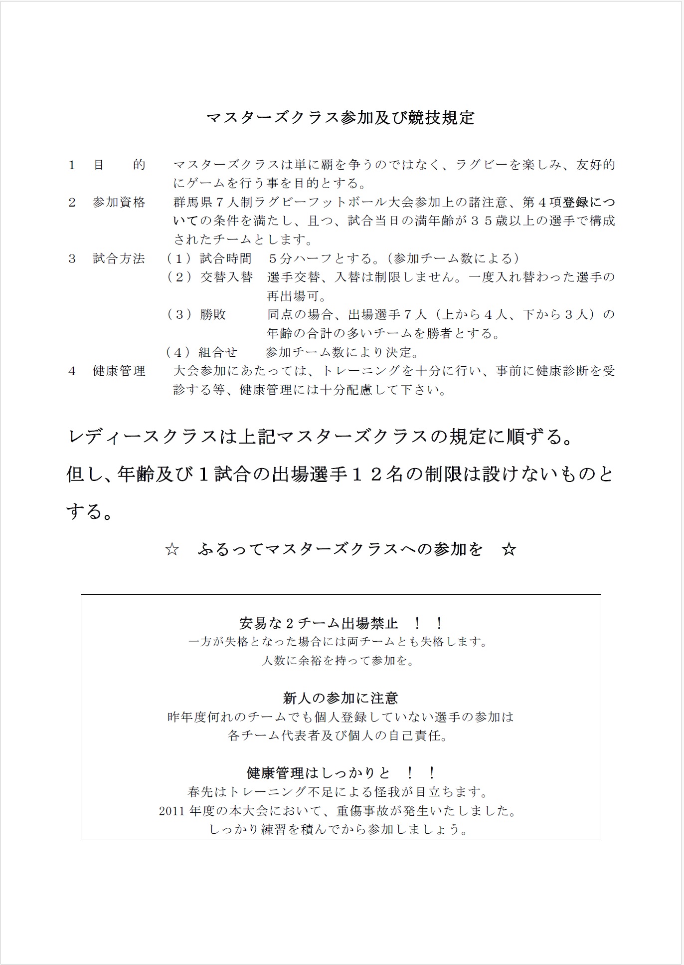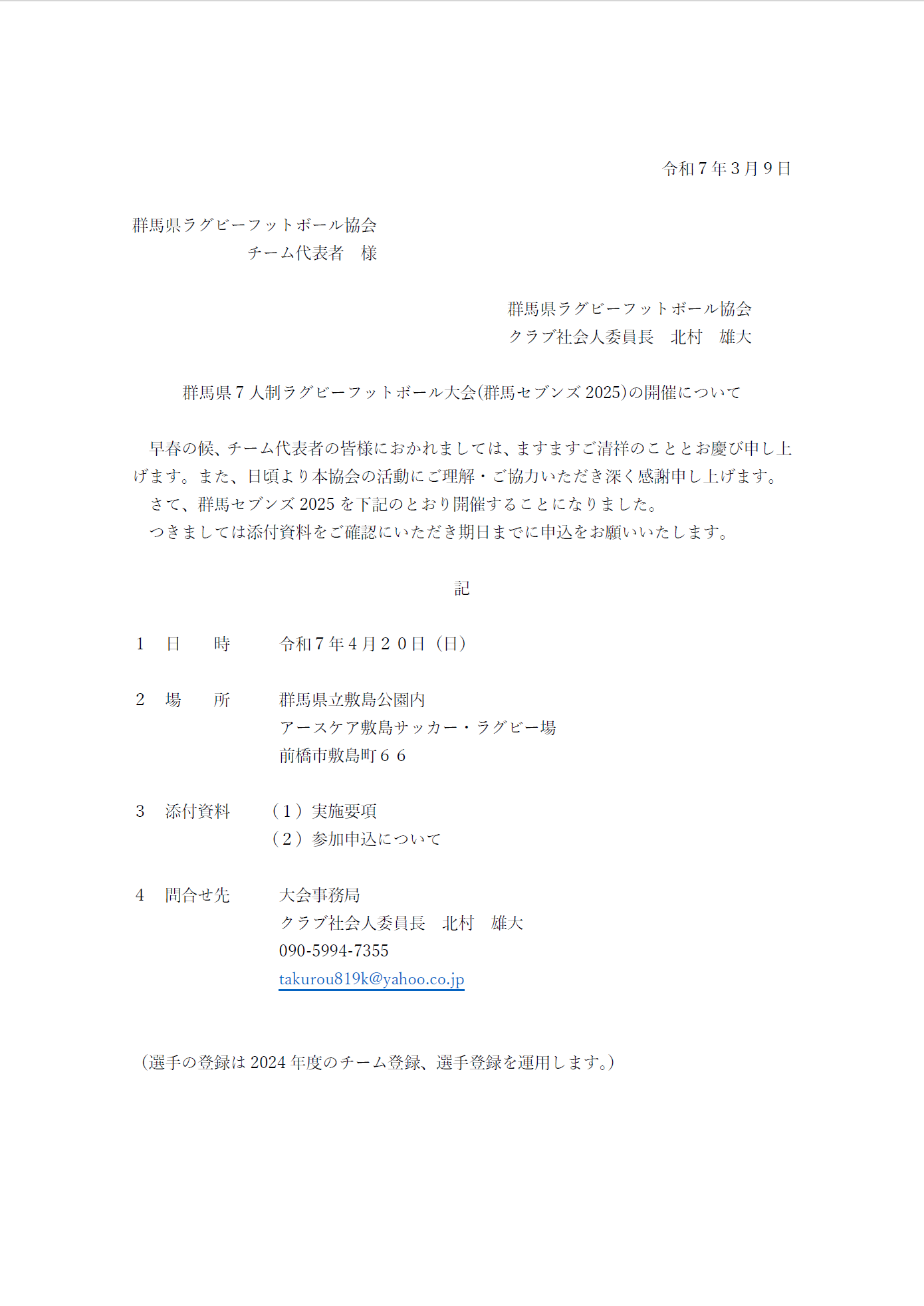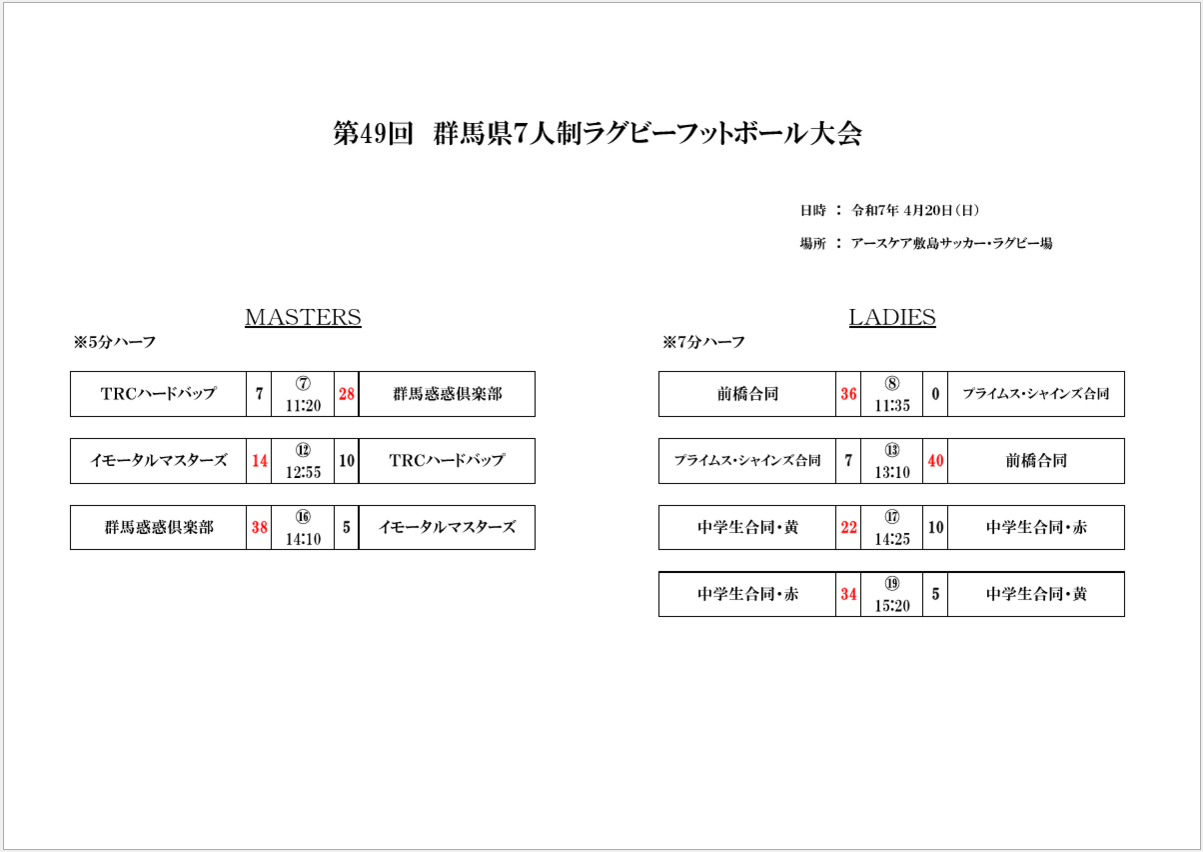 HOME 県協会とは お知らせ » ニュース ニュース一覧 試合結果 facebook » 公式 チケット販売 大学 委員会 » ジュニア 高校 大学 クラブ社会人 競技 コーチ 普及育成 総務 メディカル 安全対策 レフリー アセッサー 強化セレクション 競技場 チケット お問い合わせ 住所 電話 メール 第49回群馬県7人制ラグビーフットボール大会(群馬セブンズ2025) 組合・結果 案内 実施要項 競技規定 諸注意