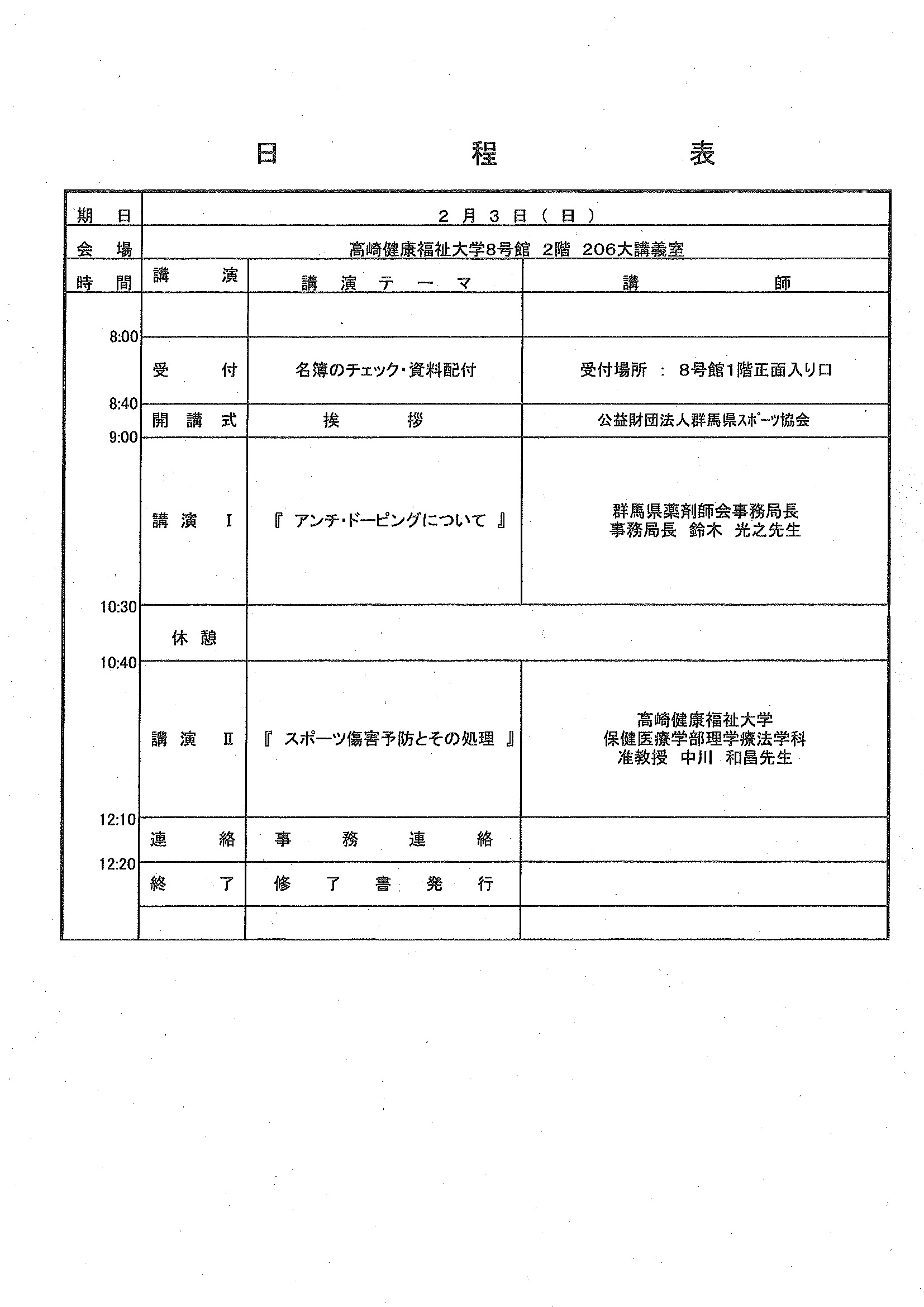 平成30年度第2回群馬県スポーツ指導者研修会/総務 ダウンロード 開催要項 ファイル名 2019-02-03.pdf(Adobe acrobat) 平成30年度第2回群馬県スポーツ指導者研修会開催要項 日程