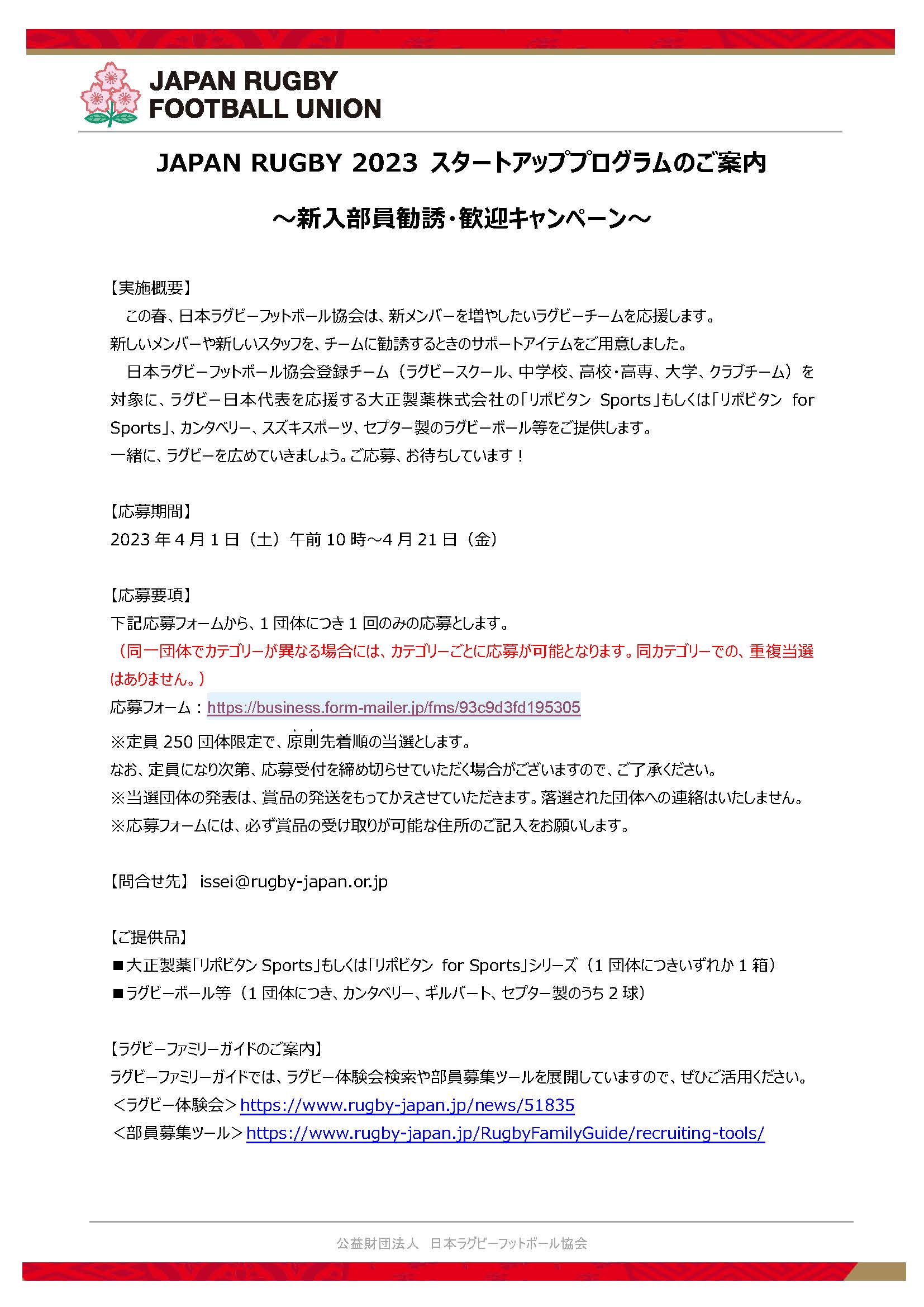 HOME 県協会とは お知らせ » ニュース ニュース一覧 試合結果 facebook » 公式 チケット販売 大学 委員会 » ジュニア 高校 大学 クラブ社会人 競技 コーチ 普及育成 総務 メディカル 安全対策 レフリー アセッサー 強化セレクション 競技場 チケット お問い合わせ 住所 電話 メール JAPAN RUGBY 2023 スタートアッププログラム 【応募フォーム】 https://business.form-mailer.jp/fms/93c9d3fd195305 【問合せ先】 issei@rugby-japan.or.jp <ラグビー体験会> https://www.rugby-japan.jp/news/51835 <部員募集ツール> https://www.rugby-japan.jp/RugbyFamilyGuide/recruiting-tools/ ダウンロード JAPAN RUGBY 2023 スタートアッププログラムのご案内 ファイル名 jr2023spi.pdf(Adobe acrobat)