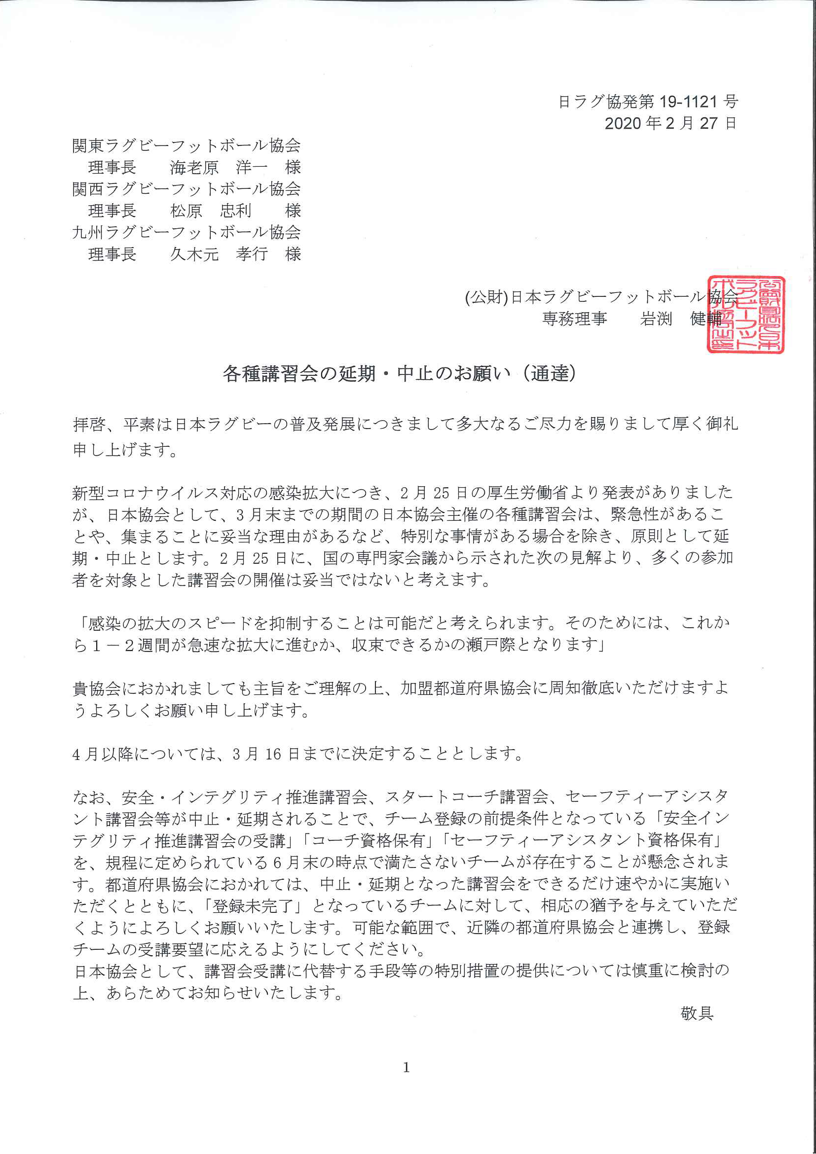 HOME 県協会とは お知らせ » ニュース ニュース一覧 試合結果 facebook » 公式 チケット販売 大学 委員会 » ジュニア 高校 大学 クラブ社会人 競技 コーチ 普及育成 総務 メディカル 安全対策 レフリー アセッサー 強化セレクション 競技場 チケット お問い合わせ 住所 電話 メール 各種講習会の延期・中止のお願い /総務
