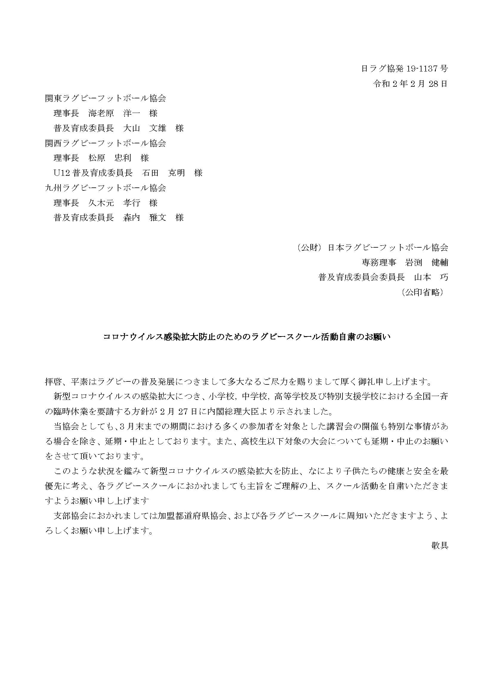 HOME 県協会とは お知らせ » ニュース ニュース一覧 試合結果 facebook » 公式 チケット販売 大学 委員会 » ジュニア 高校 大学 クラブ社会人 競技 コーチ 普及育成 総務 メディカル 安全対策 レフリー アセッサー 強化セレクション 競技場 チケット お問い合わせ 住所 電話 メール コロナウイルス感染拡大防止のためのラグビースクール活動自粛のお願い / 総務