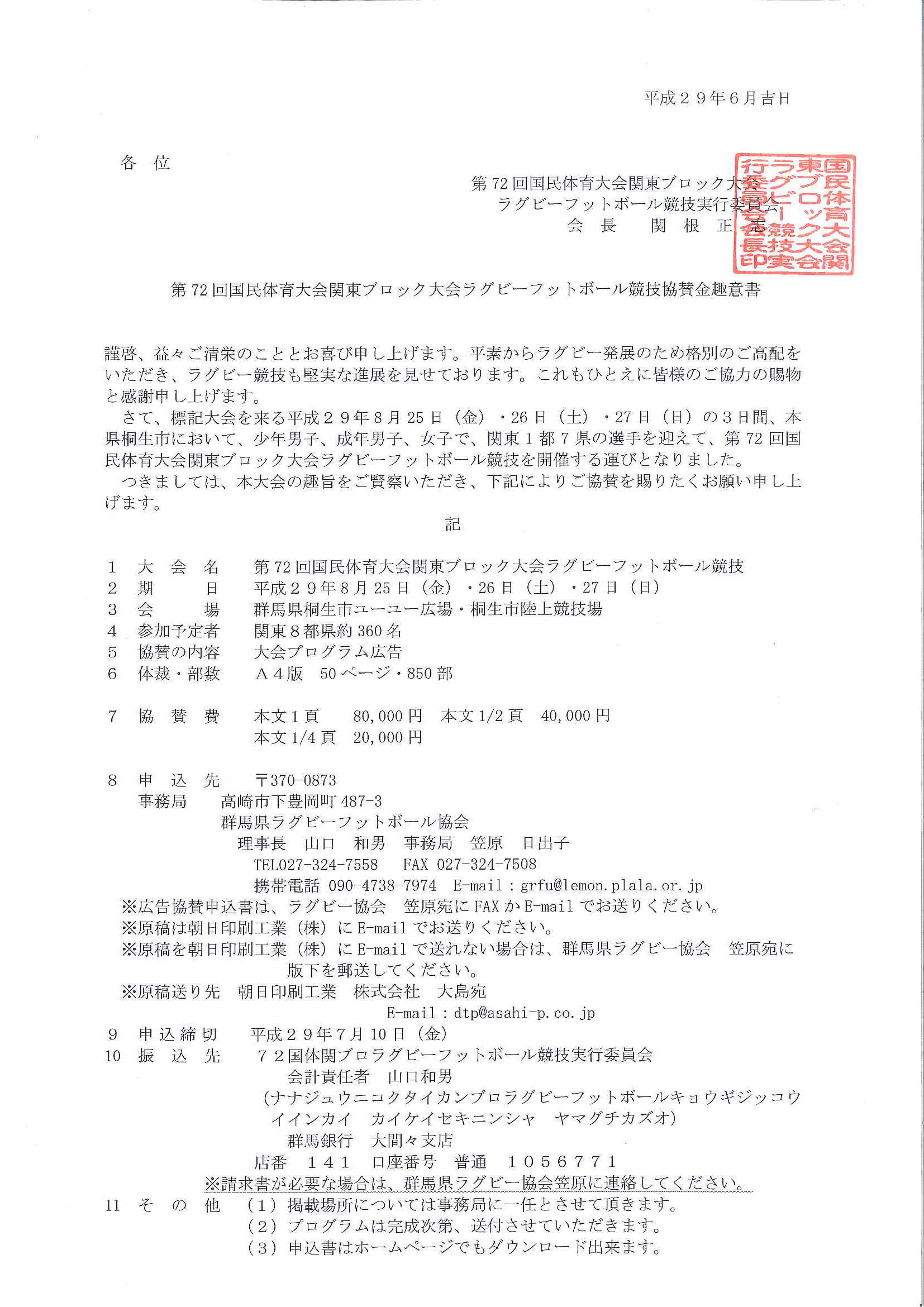 第72回国民体育大会関東ブロック大会ラグビーフットボール競技 協賛金趣意書