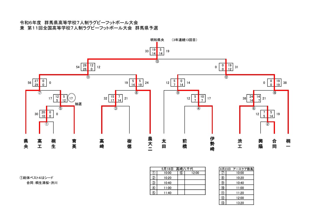 HOME 県協会とは お知らせ » ニュース ニュース一覧 試合結果 facebook » 公式 チケット販売 大学 委員会 » ジュニア 高校 大学 クラブ社会人 競技 コーチ 普及育成 総務 メディカル 安全対策 レフリー アセッサー 強化セレクション 競技場 チケット お問い合わせ 住所 電話 メール 令和6年度 群馬県高等学校ラグビーフットボール7人制大会 令和6年度 第11回全国高等学校7人制ラグビーフットボール大会 群馬県予選 試合組合せ
