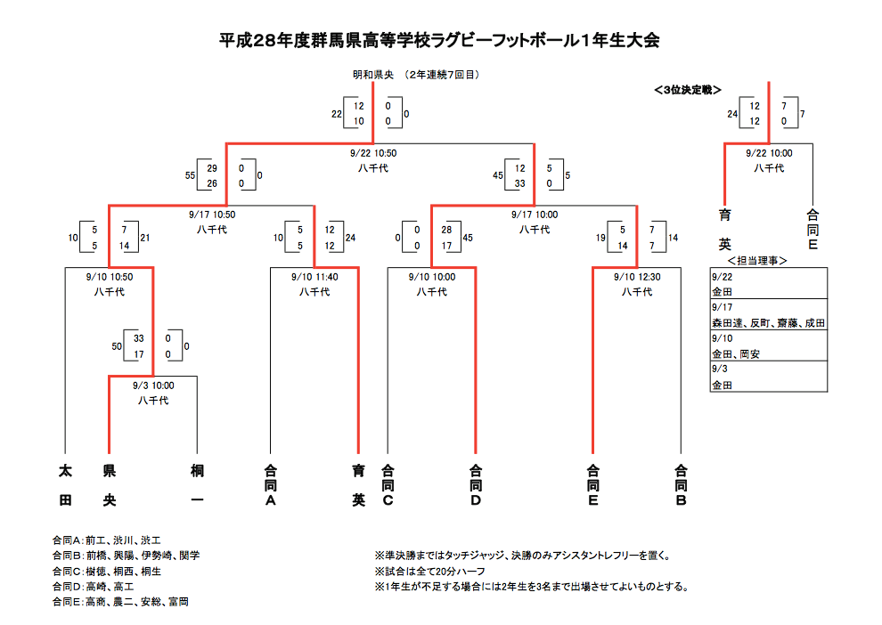 HOME 県協会とは お知らせ » ニュース ニュース一覧 試合結果 facebook » 公式 チケット販売 大学 委員会 » ジュニア 高校 大学 クラブ社会人 競技 コーチ 普及育成 総務 メディカル 安全対策 レフリー アセッサー 強化セレクション 競技場 チケット お問い合わせ 住所 電話 メール 平成28年度群馬県高等学校ラグビーフットボール1年生大会