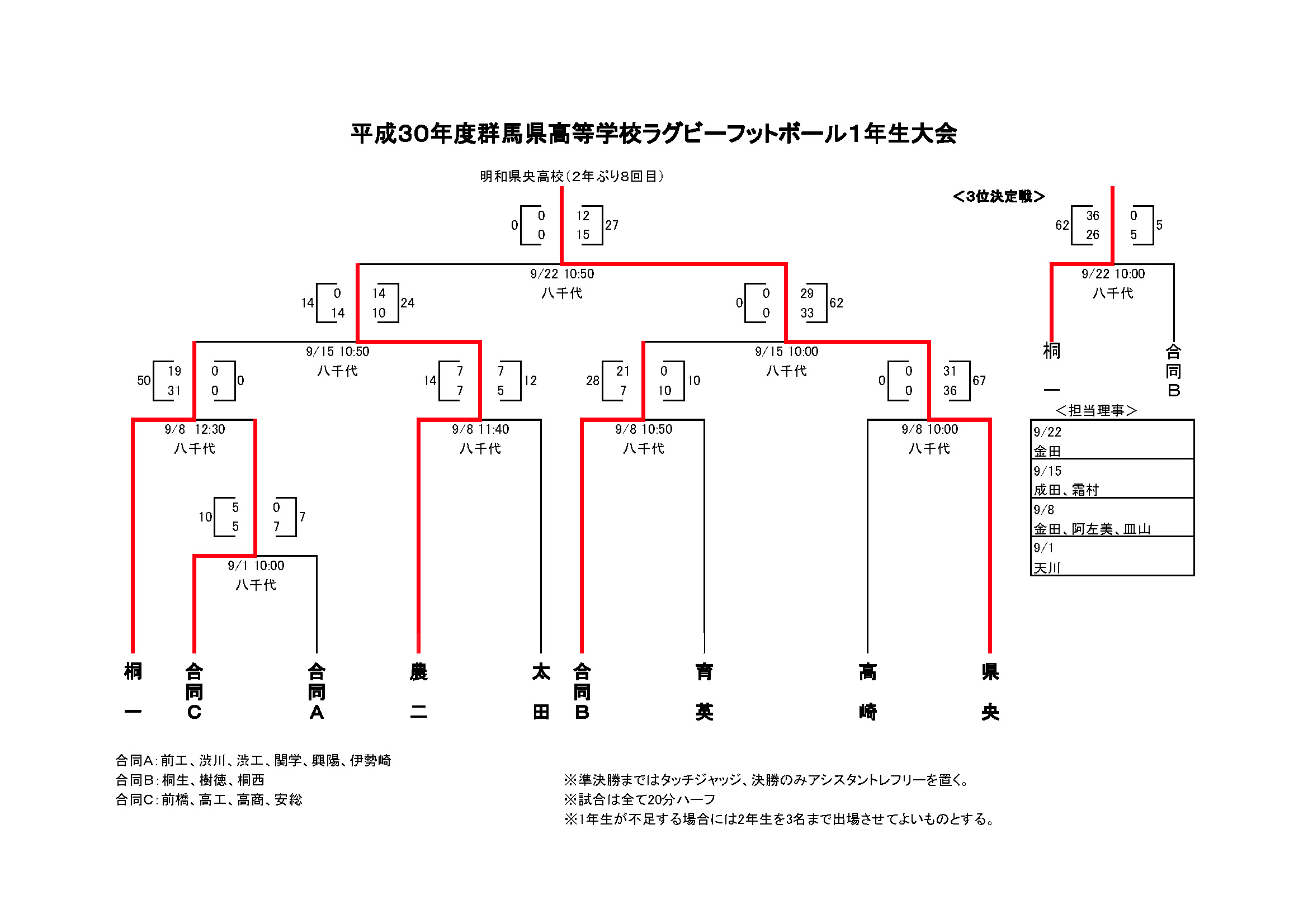 HOME 県協会とは お知らせ » ニュース ニュース一覧 試合結果 facebook » 公式 チケット販売 大学 委員会 » ジュニア 高校 大学 クラブ社会人 競技 コーチ 普及育成 総務 メディカル 安全対策 レフリー アセッサー 強化セレクション 競技場 チケット お問い合わせ 住所 電話 メール 平成30年度群馬県高等学校ラグビーフットボール1年生大会