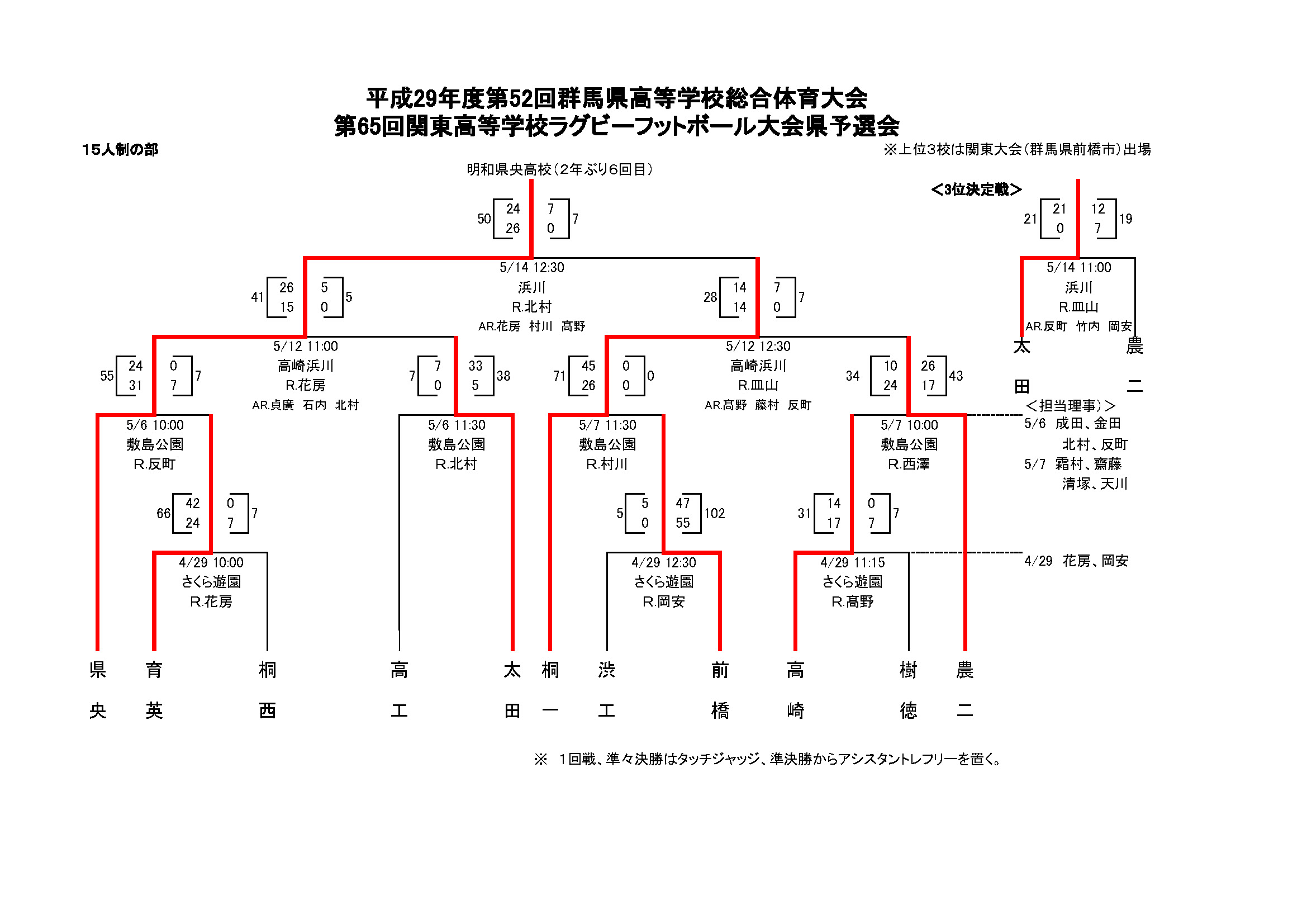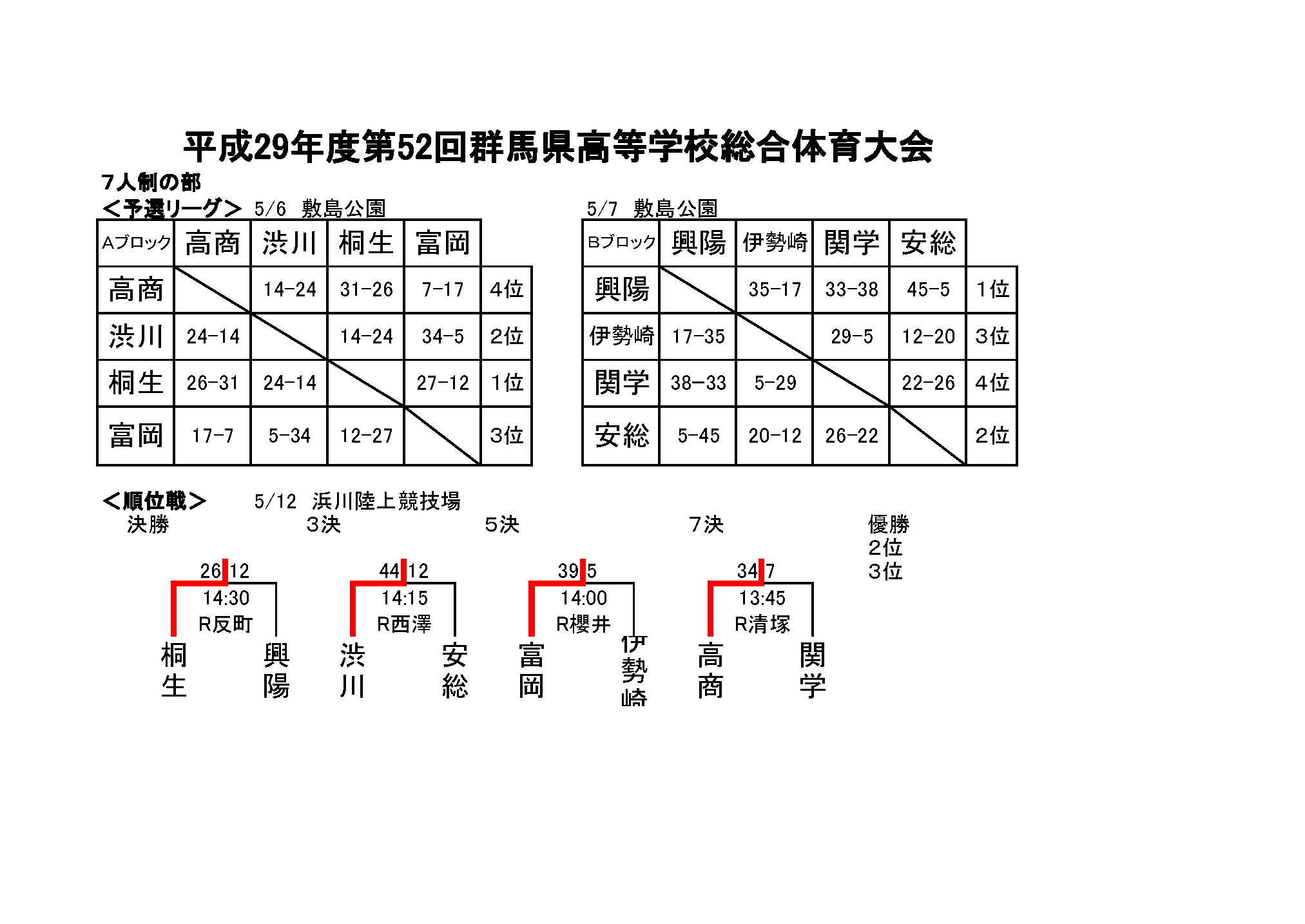 HOME 県協会とは お知らせ » ニュース ニュース一覧 試合結果 facebook » 公式 チケット販売 大学 委員会 » ジュニア 高校 大学 クラブ社会人 競技 コーチ 普及育成 総務 メディカル 安全対策 レフリー アセッサー 強化セレクション 競技場 チケット お問い合わせ 住所 電話 メール 平成29年度 第52回群馬県高等学校総合体育大会高校 15人制の部 7人制の部