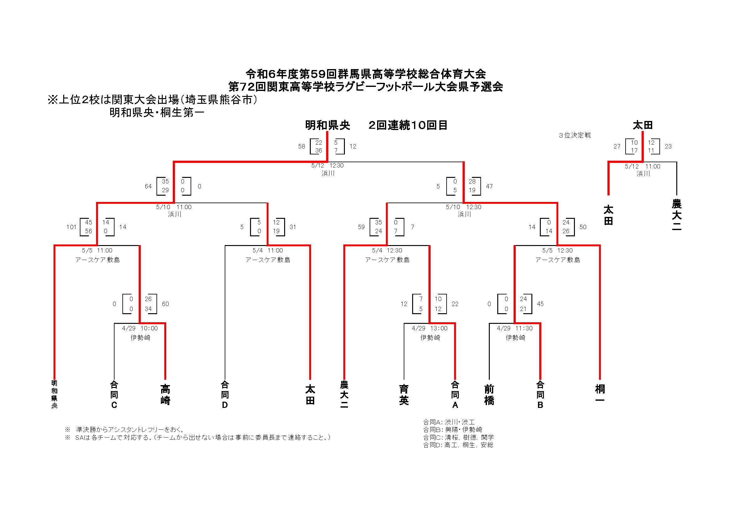 HOME 県協会とは お知らせ » ニュース ニュース一覧 試合結果 facebook » 公式 チケット販売 大学 委員会 » ジュニア 高校 大学 クラブ社会人 競技 コーチ 普及育成 総務 メディカル 安全対策 レフリー アセッサー 強化セレクション 競技場 チケット お問い合わせ 住所 電話 メール 令和6年度第59回群馬県高等学校総合体育大会 第72回関東高等学校ラグビーフットボール大会県予選会