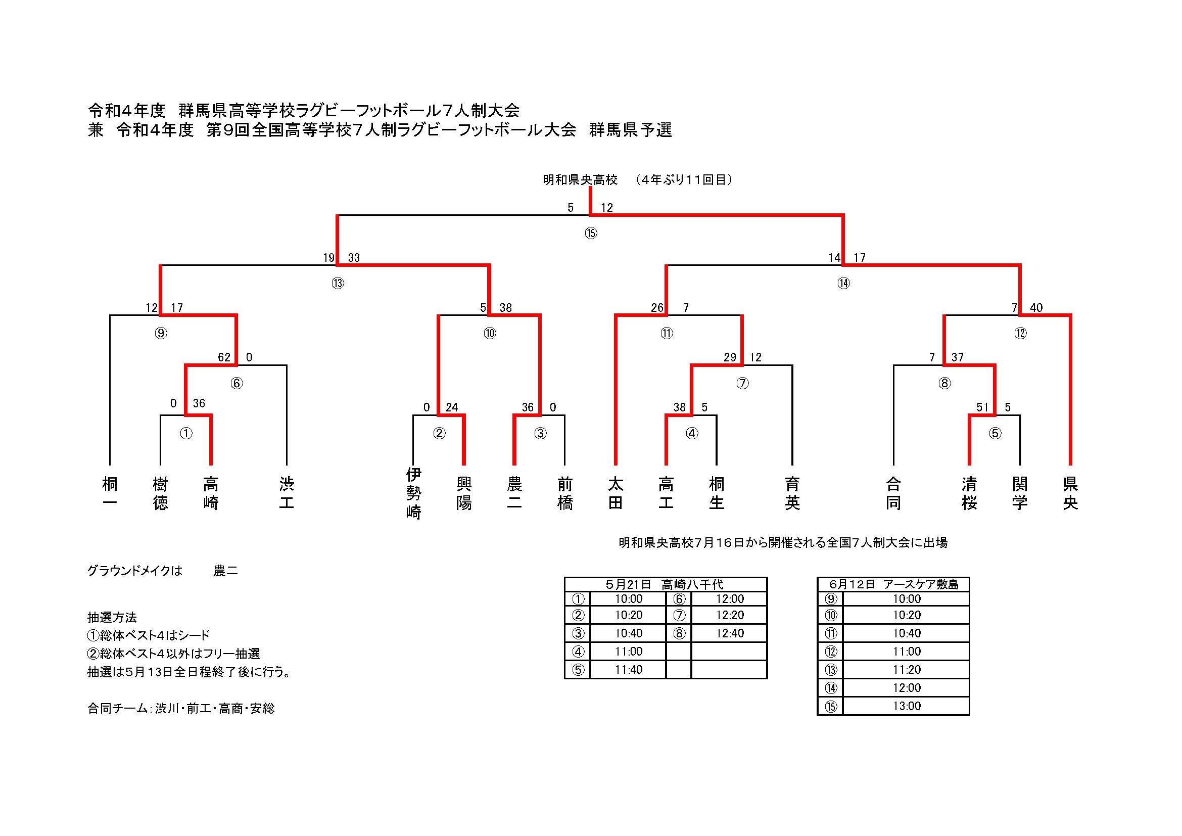 HOME 県協会とは お知らせ » ニュース ニュース一覧 試合結果 facebook » 公式 チケット販売 大学 委員会 » ジュニア 高校 大学 クラブ社会人 競技 コーチ 普及育成 総務 メディカル 安全対策 レフリー アセッサー 強化セレクション 競技場 チケット お問い合わせ 住所 電話 メール 令和4年度 群馬県高等学校ラグビーフットボール7人制大会 令和4年度 第9回全国高等学校7人制ラグビーフットボール大会 群馬県予選 試合結果