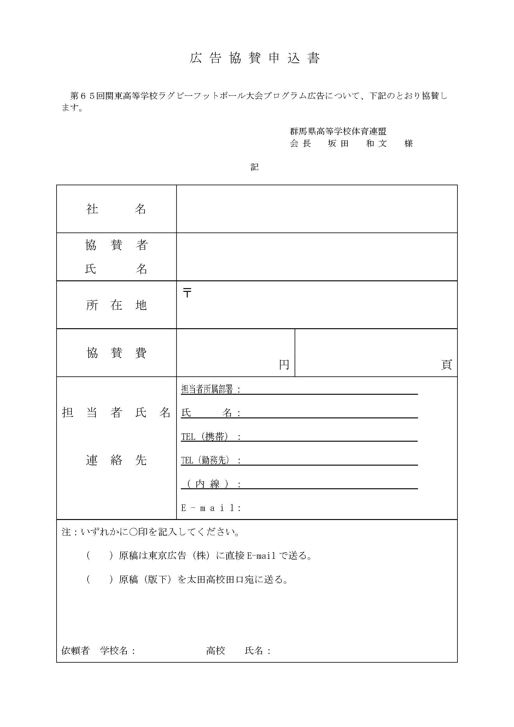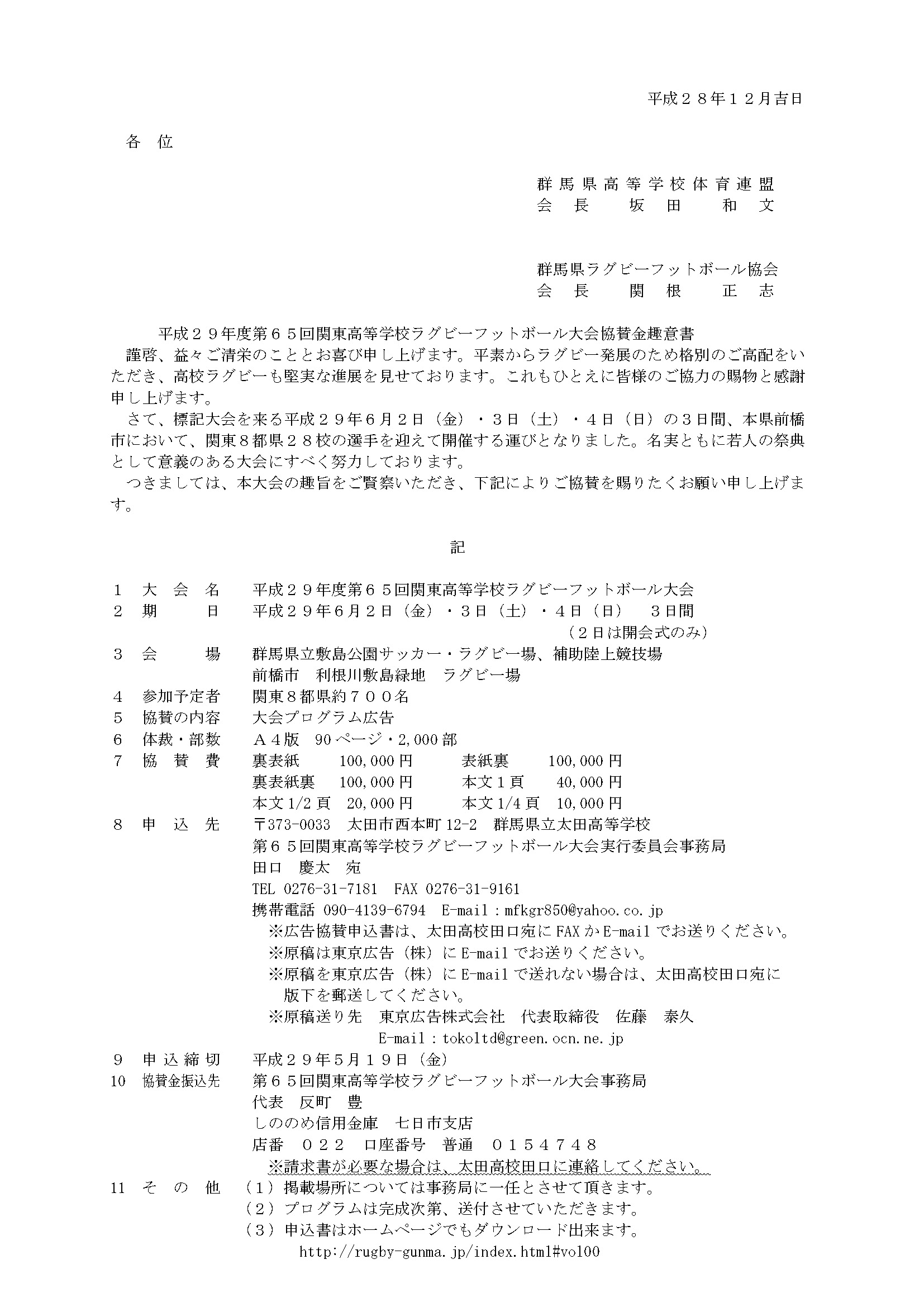 平成29年度第65回関東高等学校ラグビーフットボール大会 平成29年度第65回関東高等学校ラグビーフットボール大会協賛金趣意書 Microsoft Excel Document ファイル名 prospectus2017_2016-11-29.docx(Microsoft Word Document) Adobe Acrobat ファイル名 prospectus2017_2016-11-29.pdf(Adobe Acrobat)