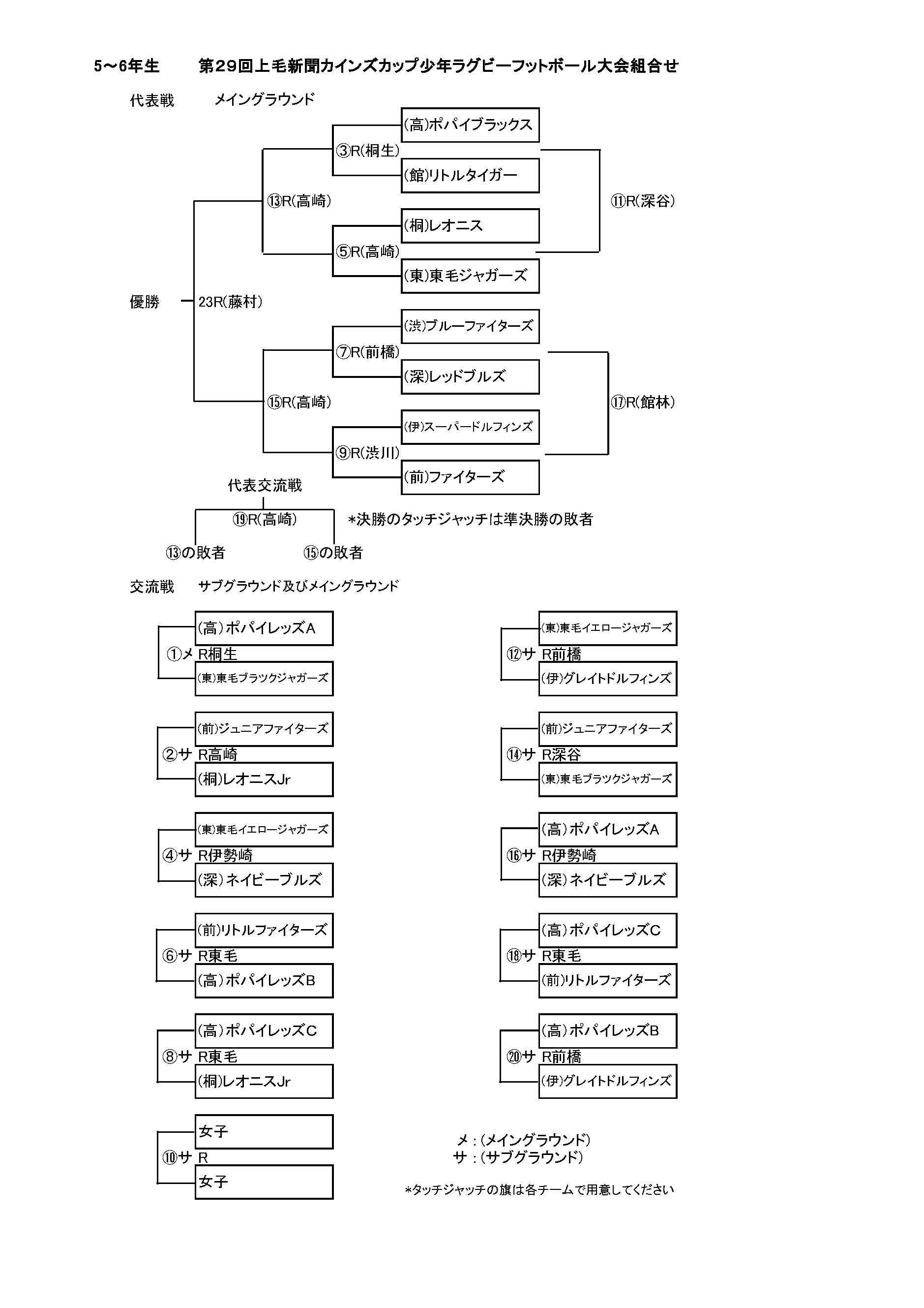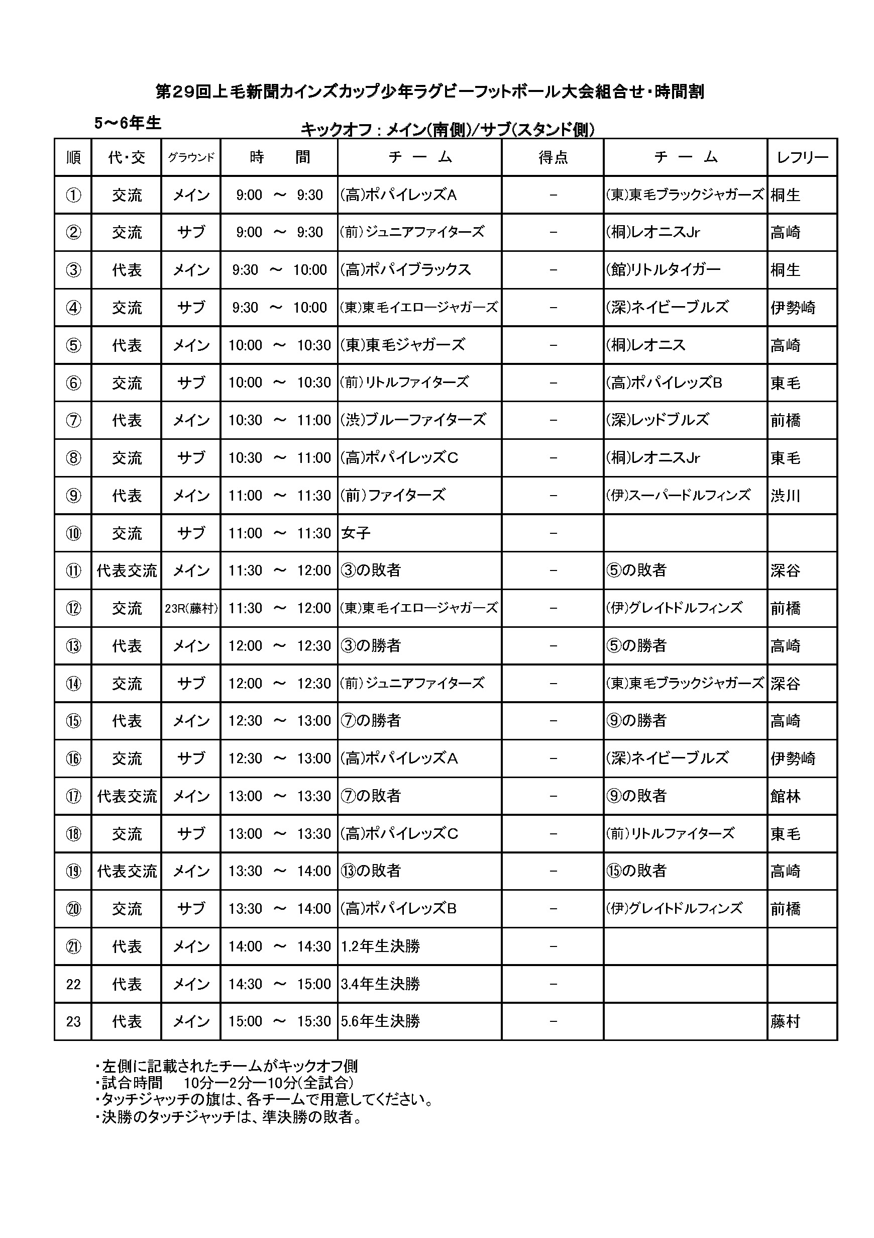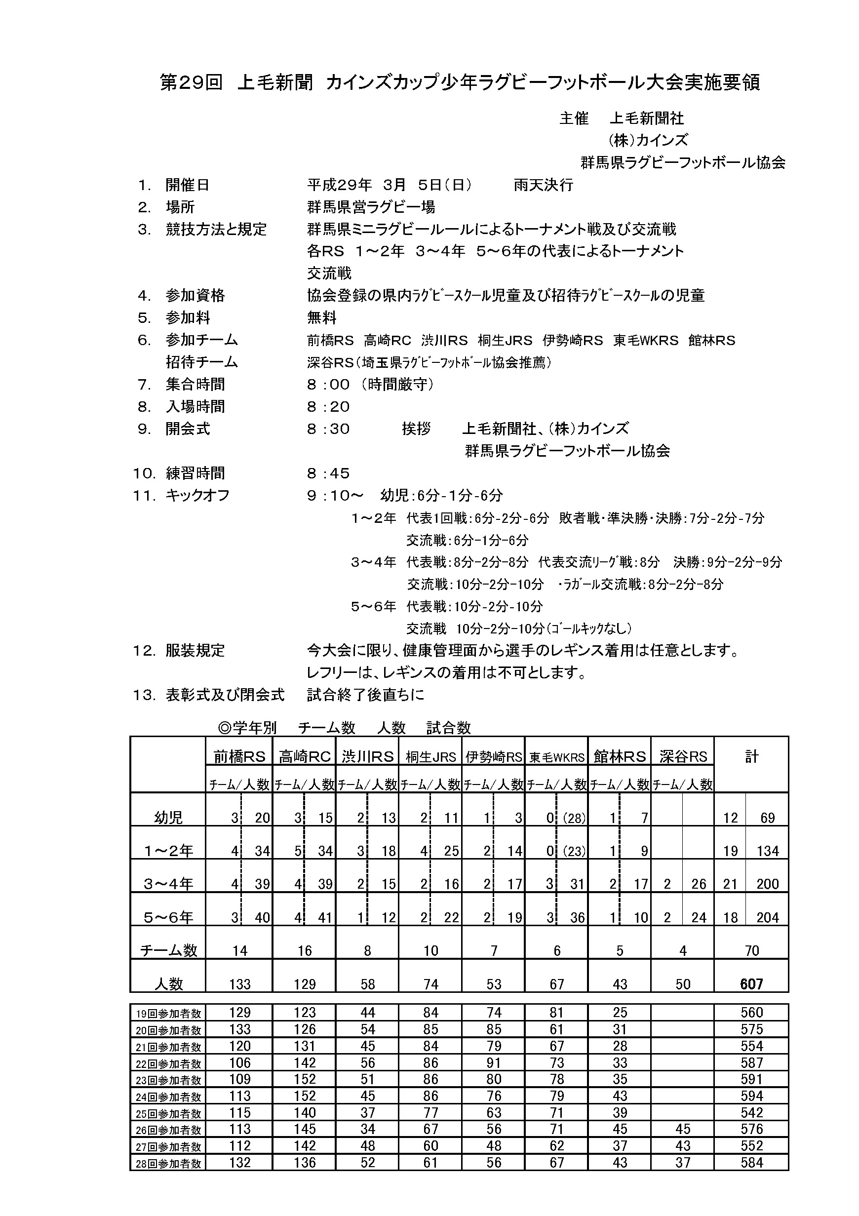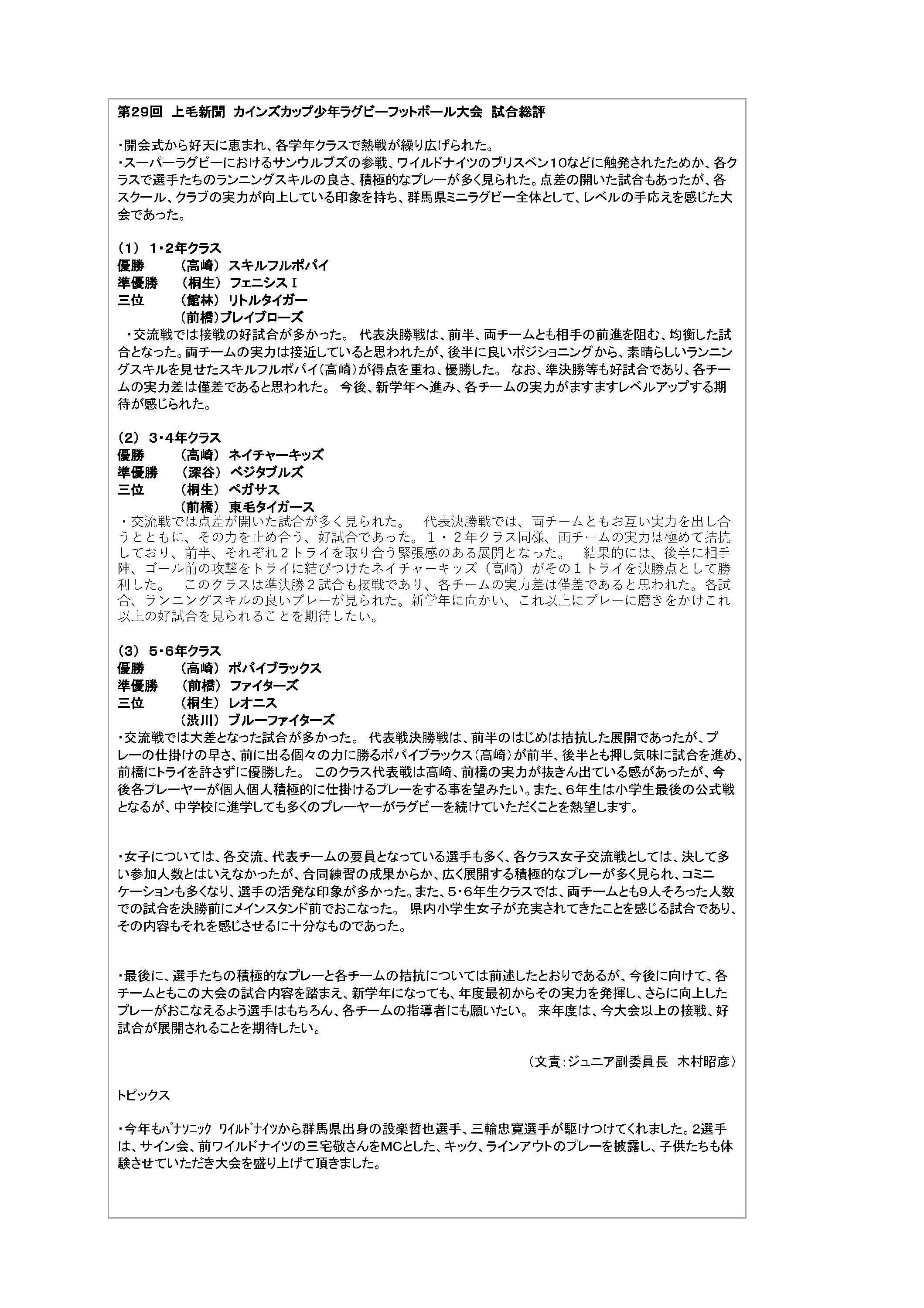 第29回 上毛新聞 カインズカップ少年ラグビーフットボール大会 試合結果 試合総評 5~6年生 3~4年生 1~2年生 女子交流戦 実施要領 実施要領 ファイル名 29thcainzcup.xls(Microsoft Excel Document) 実施要領詳細