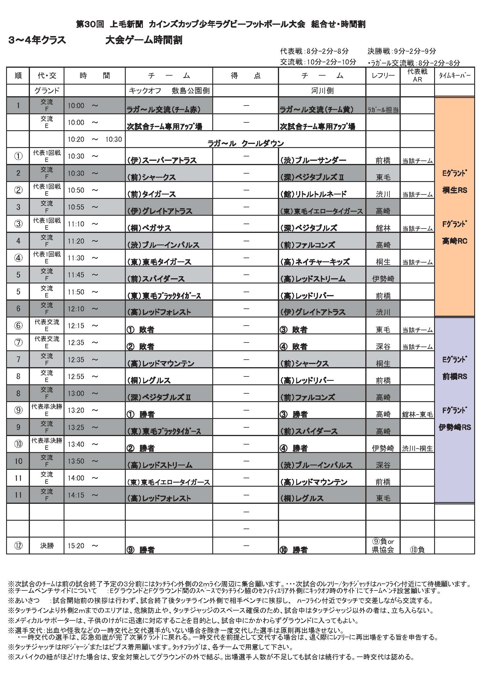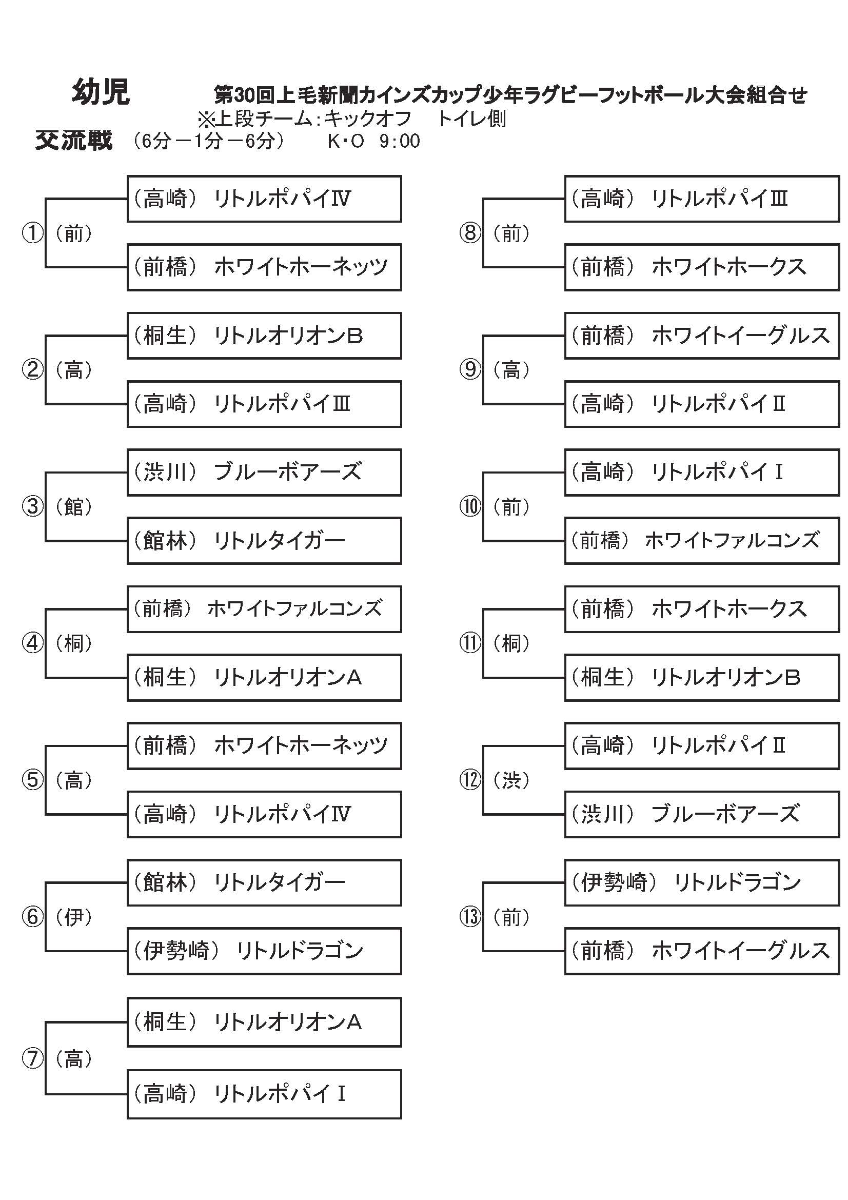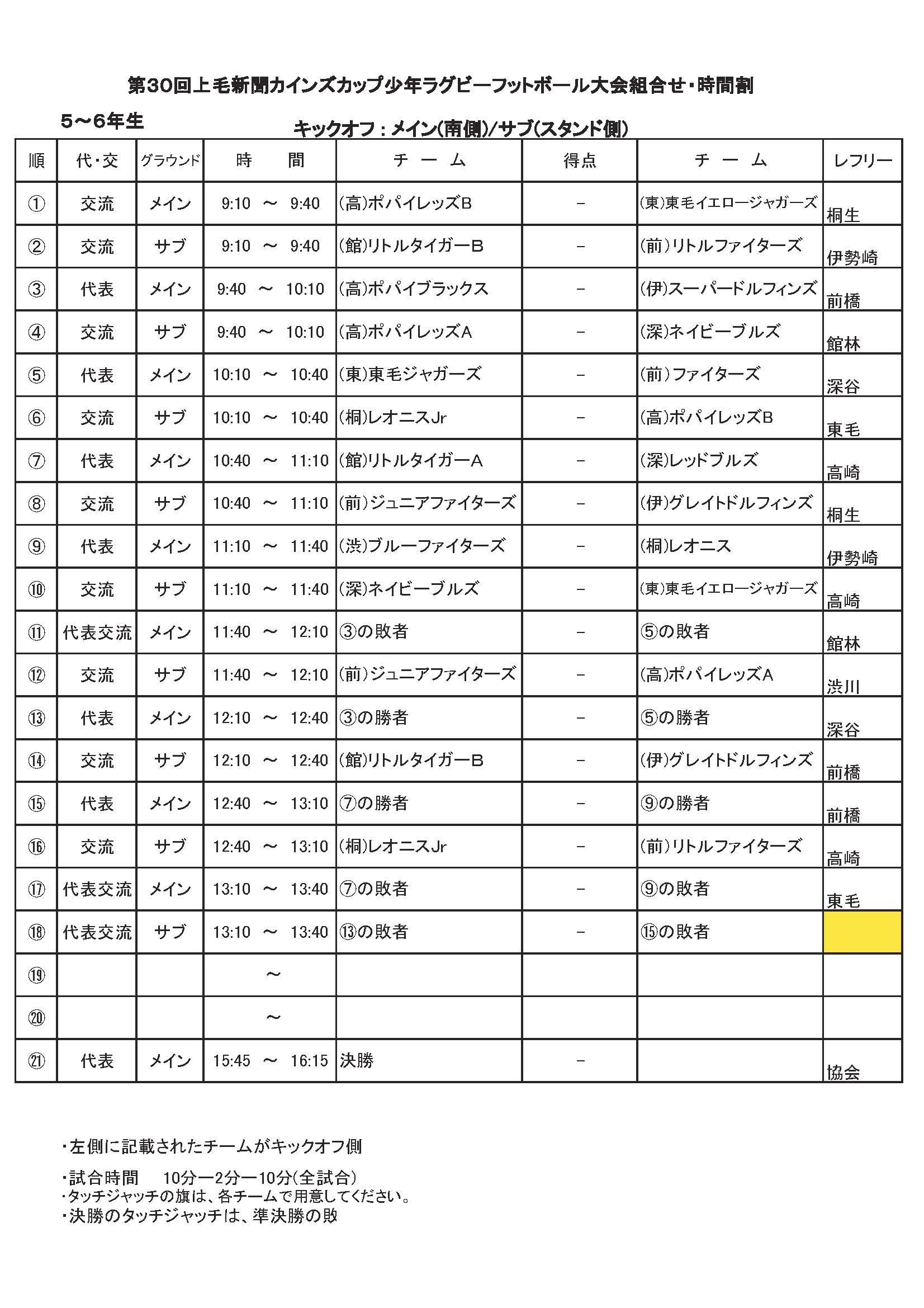 HOME 県協会とは お知らせ » ニュース ニュース一覧 試合結果 facebook » 公式 チケット販売 大学 委員会 » ジュニア 高校 大学 クラブ社会人 競技 コーチ 普及育成 総務 メディカル 安全対策 レフリー アセッサー 強化セレクション 競技場 チケット お問い合わせ 住所 電話 メール 第30回 上毛新聞 カインズカップ少年ラグビーフットボール大会 実施要領 5~6年生 交流戦 3~4年生 交流戦 1~2年生 交流戦 幼児 交流戦 組合せ・時間割 5~6年生 <3~4年生 1~2年生 幼児
