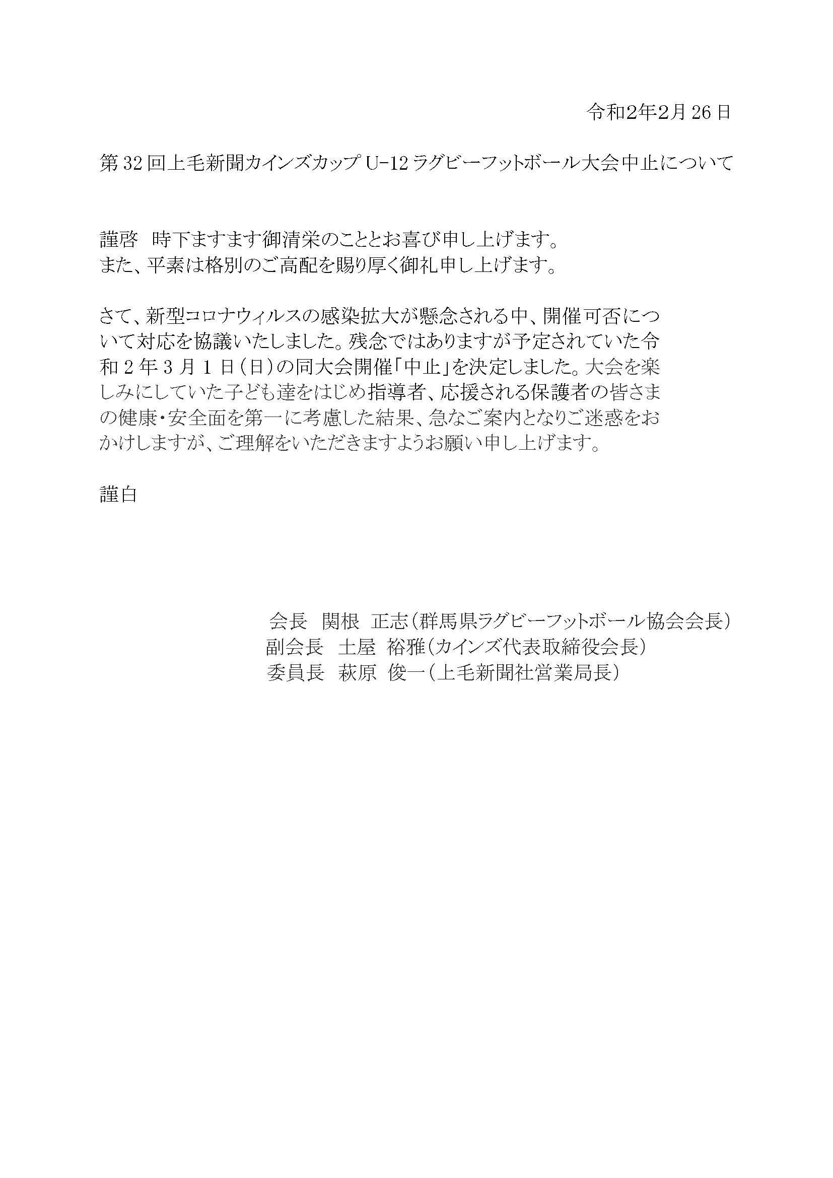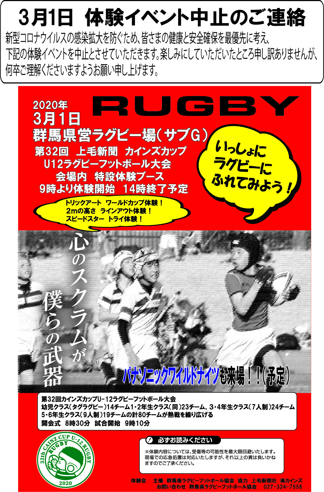 HOME 県協会とは お知らせ » ニュース ニュース一覧 試合結果 facebook » 公式 チケット販売 大学 委員会 » ジュニア 高校 大学 クラブ社会人 競技 コーチ 普及育成 総務 メディカル 安全対策 レフリー アセッサー 強化セレクション 競技場 チケット お問い合わせ 住所 電話 メール 第32回 上毛新聞 カインズカップ少年ラグビーフットボール大会 大会中止について 大会中止に伴い以下の体験会も中止