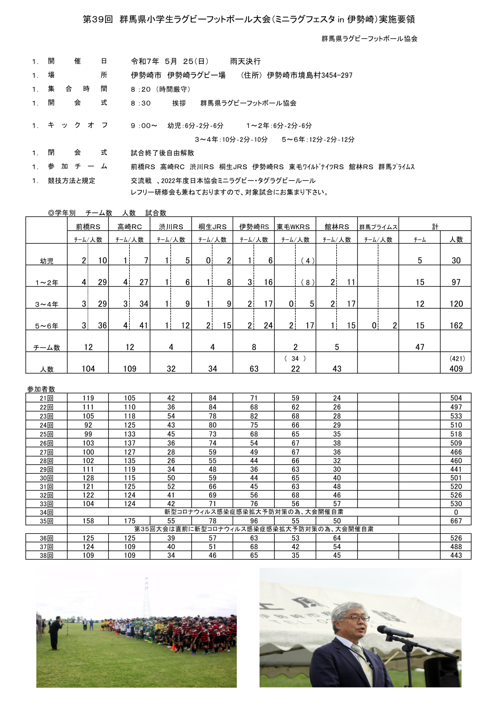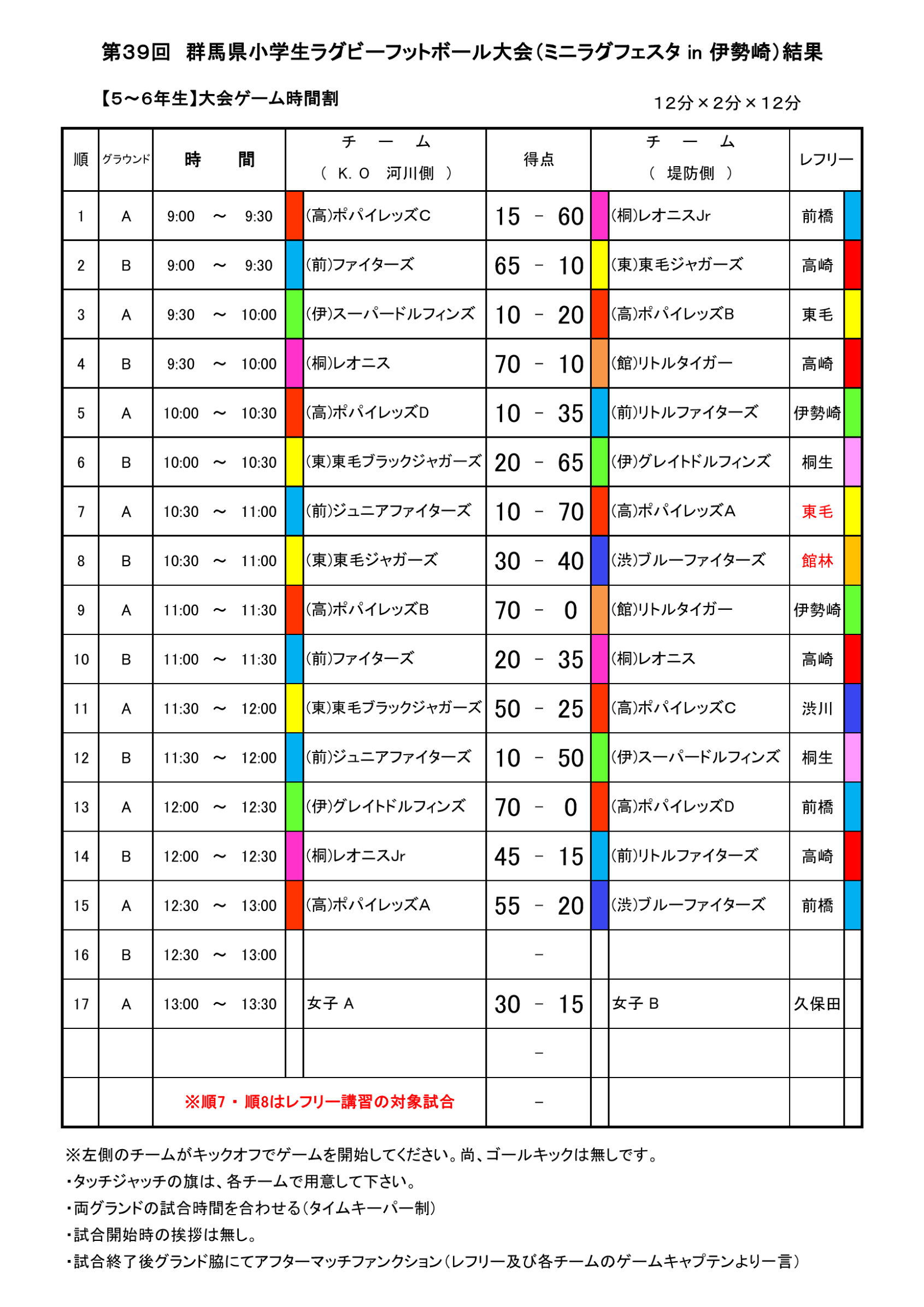 HOME 県協会とは お知らせ » ニュース ニュース一覧 試合結果 facebook » 公式 チケット販売 大学 委員会 » ジュニア 高校 大学 クラブ社会人 競技 コーチ 普及育成 総務 メディカル 安全対策 レフリー アセッサー 強化セレクション 競技場 チケット お問い合わせ 住所 電話 メール 第39回群馬県小学生大会(ミニ・ラグフェスタ イン 伊勢崎) 実施要領 報告 ギャラリー 結果 組合せ表