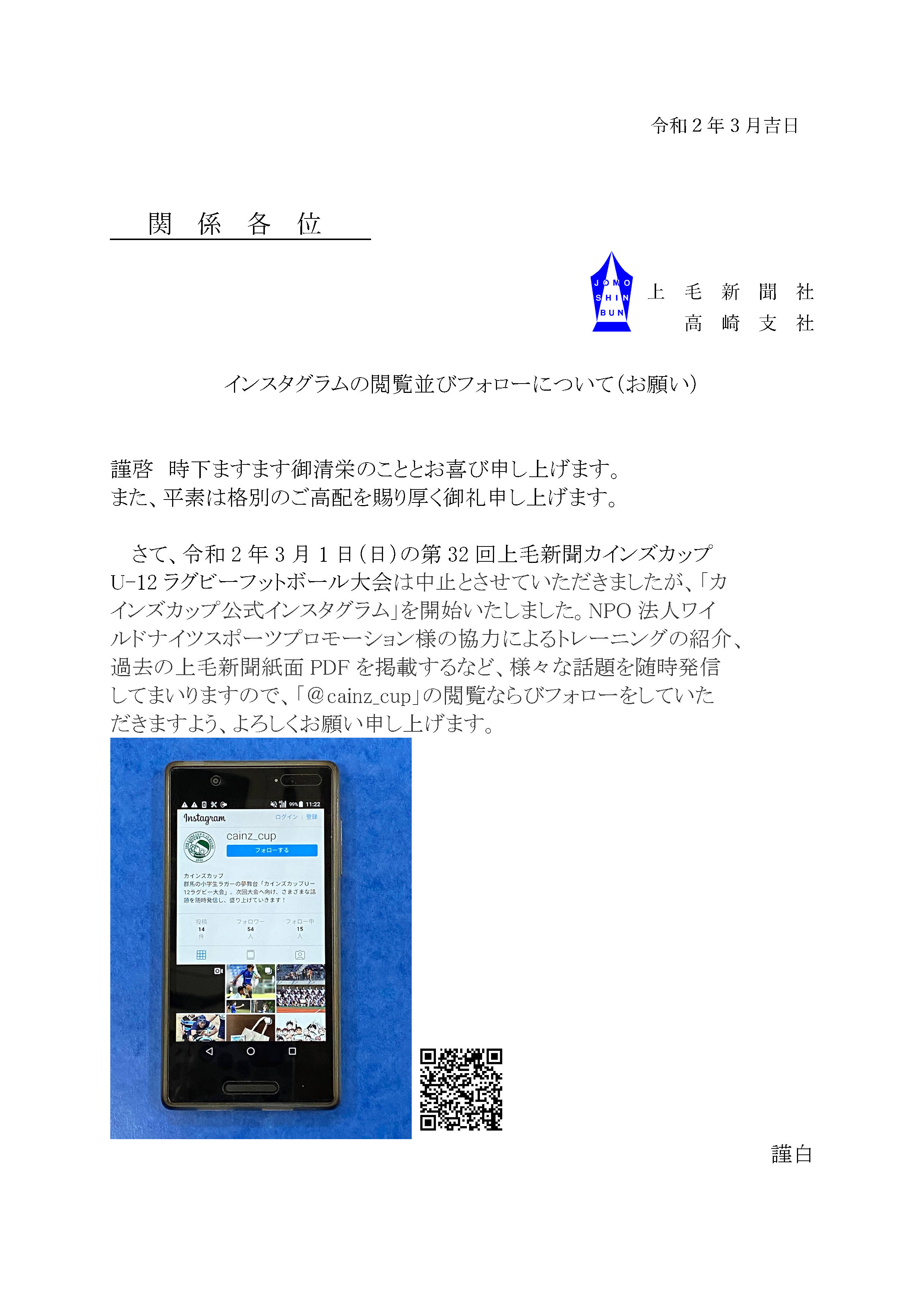 HOME 県協会とは お知らせ » ニュース ニュース一覧 試合結果 facebook » 公式 チケット販売 大学 委員会 » ジュニア 高校 大学 クラブ社会人 競技 コーチ 普及育成 総務 メディカル 安全対策 レフリー アセッサー 強化セレクション 競技場 チケット お問い合わせ 住所 電話 メール 上毛新聞 カインズカップ少年ラグビーフットボール大会 インスタグラムの閲覧並びフォローについて(お願い) QRコード ショートカット カインズカップ