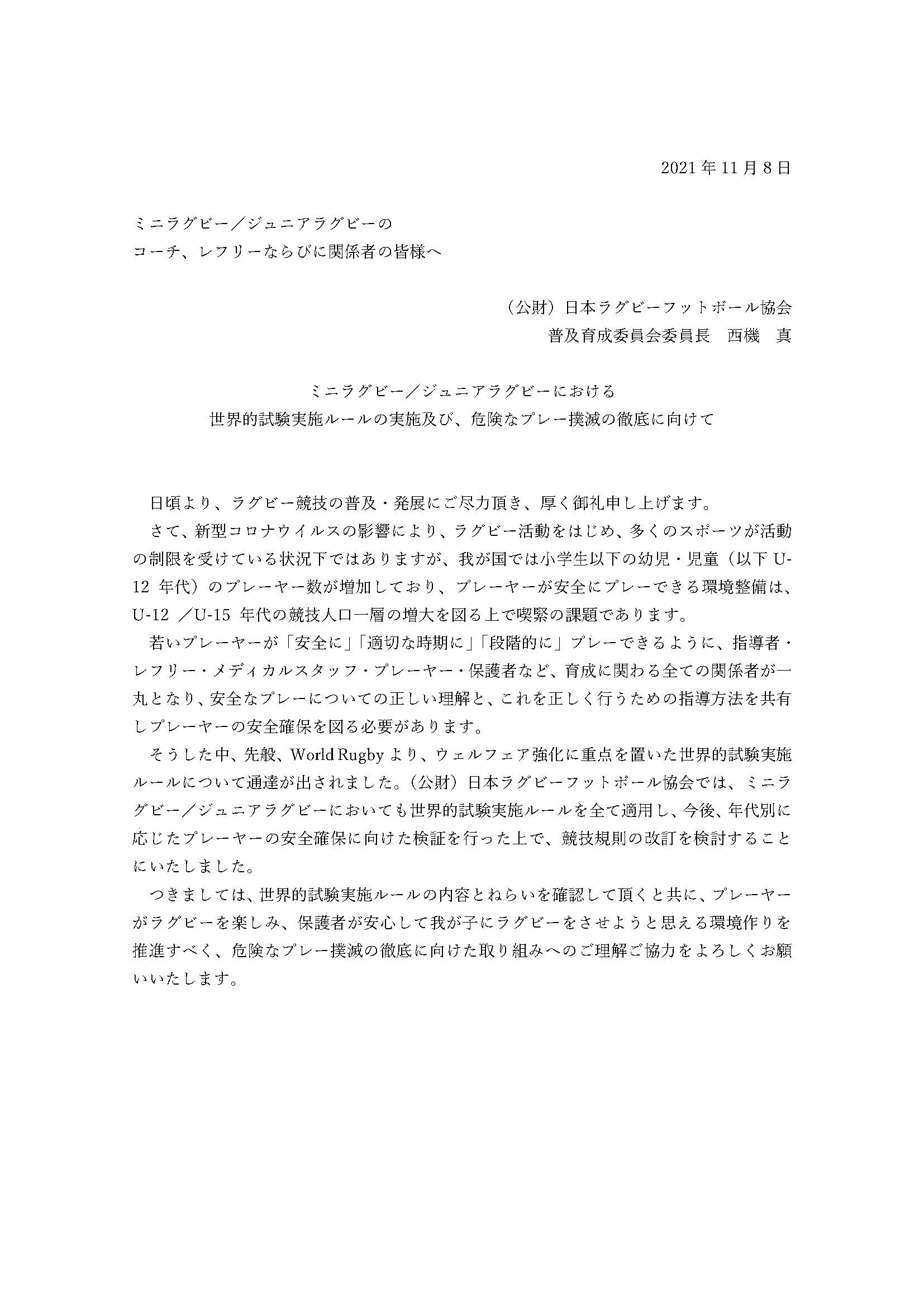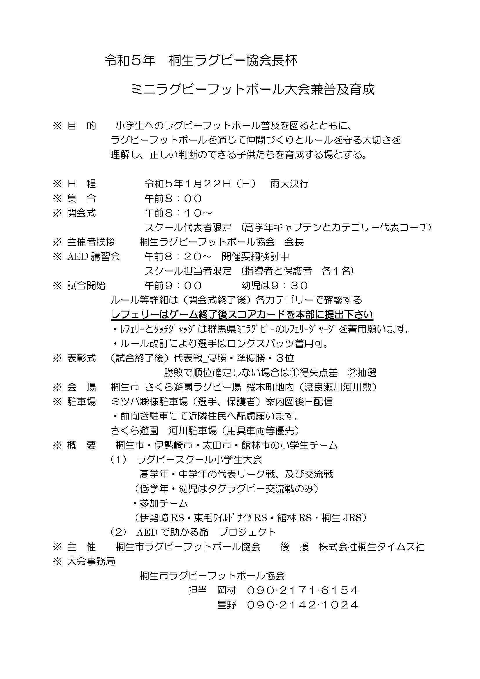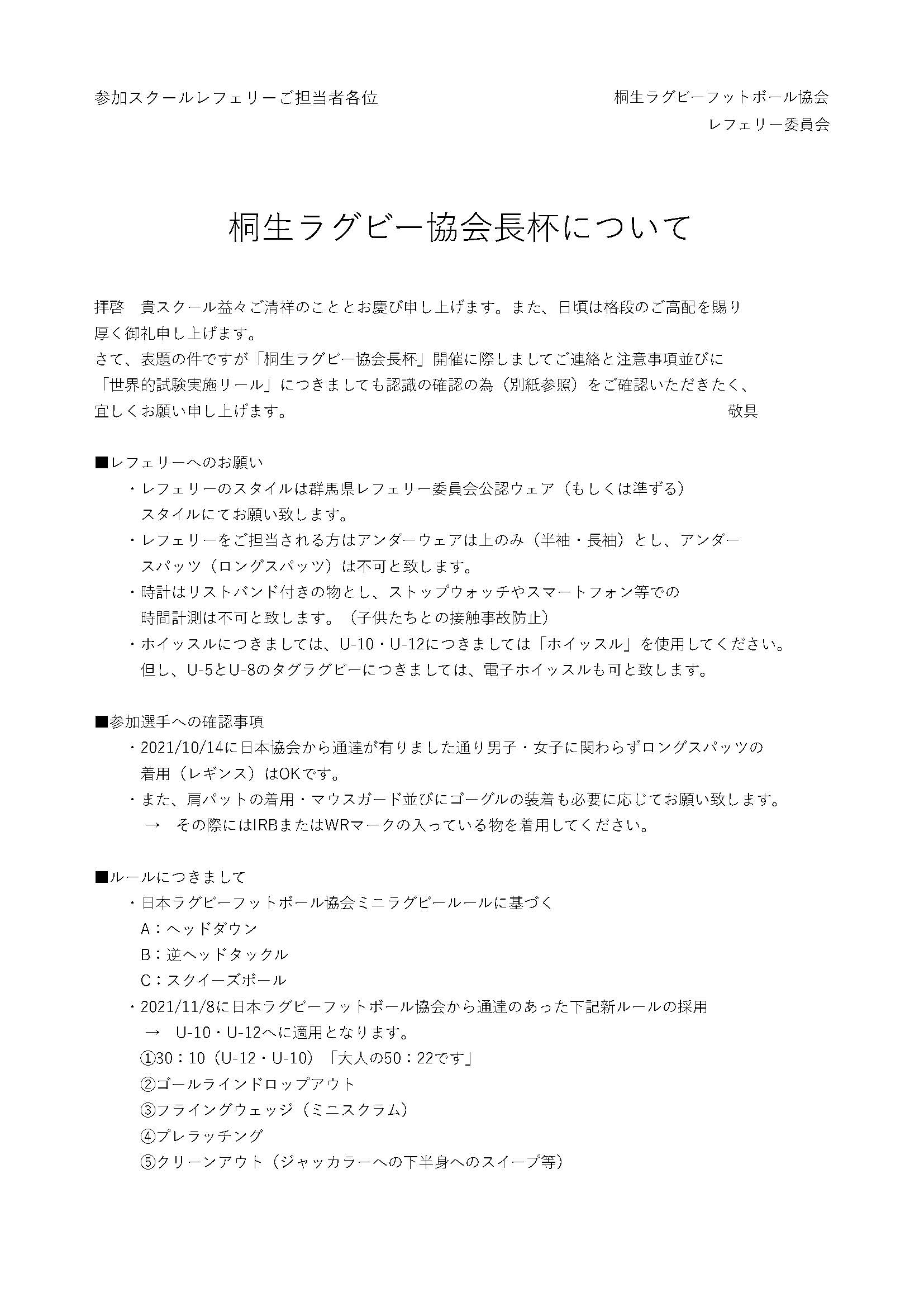 ジュニア|令和5年 桐生ラグビー協会長杯 ミニラグビーフットボール大会兼普及育成 大会実施要領 Adobe Acrobat 0104.Acrobat) 桐生ラグビー協会長杯_レフェリー伝達事項 Adobe Acrobat referee.Acrobat) 日本協会_U12以下_新ルール Adobe Acrobat rule.Acrobat) 別表_U12及びU15における禁止行為 Adobe Acrobat rule2.Acrobat)
