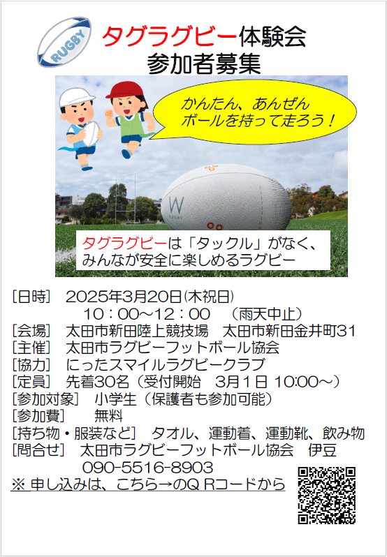HOME 県協会とは お知らせ » ニュース ニュース一覧 試合結果 facebook » 公式 チケット販売 大学 委員会 » ジュニア 高校 大学 クラブ社会人 競技 コーチ 普及育成 総務 メディカル 安全対策 レフリー アセッサー 強化セレクション 競技場 チケット お問い合わせ 住所 電話 メール タグラグビー体験会 申し込みQRコード 申し込み先へのリンク チラシ ファイル名 tag2025.pdf(Adobe Acrobat)