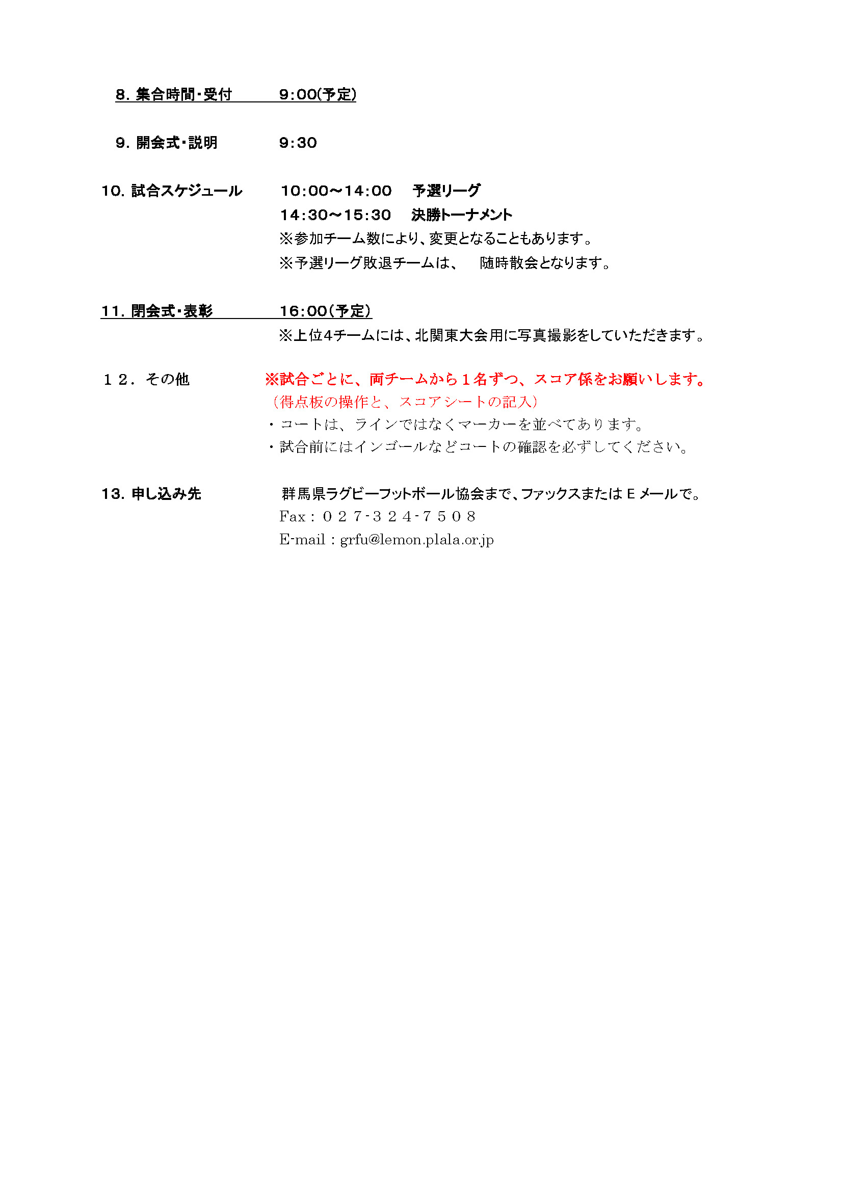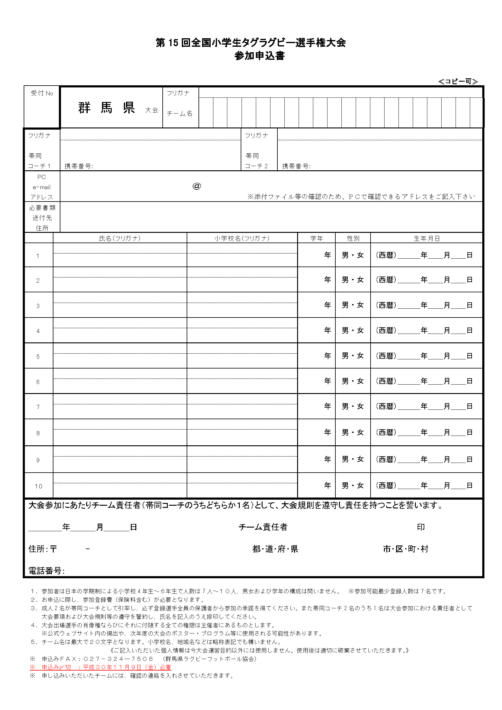 HOME 県協会とは お知らせ » ニュース ニュース一覧 試合結果 facebook » 公式 チケット販売 大学 委員会 » ジュニア 高校 大学 クラブ社会人 競技 コーチ 普及育成 総務 メディカル 安全対策 レフリー アセッサー 強化セレクション 競技場 チケット お問い合わせ 住所 電話 メール 第15回全国小学生タグラビー選手権群馬県予大会 実施要領 第15回 参加申込書 ダウンロード 第15回 参加申込書 Adobe Acrobat ファイル名 15th-tag-2018-01.pdf(Adobe Acrobat) Micrsoft Word ファイル名 15th-tag-2018-02.doc(Micrsoft Word)